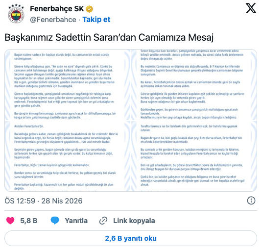Benim için bu kararı almak kolay olmadı. Ancak bu koltuk, kişisel tercihlerle değil; doğru zamanda doğru kararları alabilme sorumluluğuyla taşınır. Bugün ise şunu çok net bir şekilde ifade etmek isterim ki: Bu koltuk için savaşmanın, bu makamı bir hırs meselesine dönüştürmenin Fenerbahçe'ye hiçbir faydası yoktur.