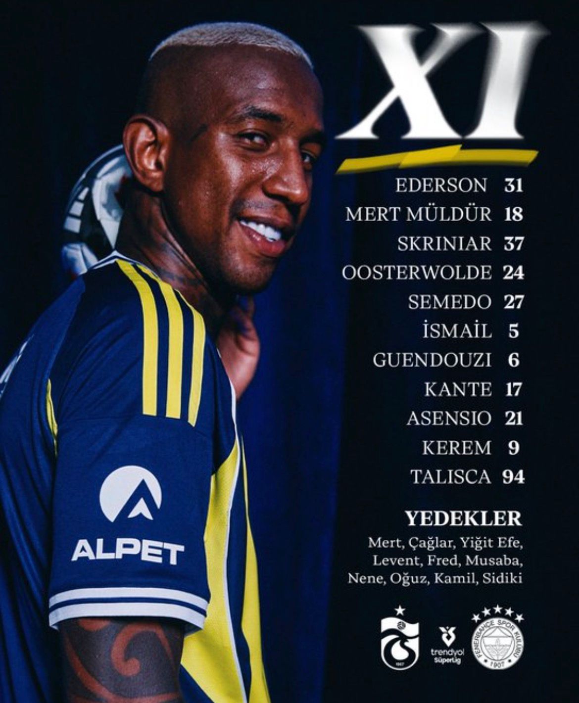 Fenerbahçe: Ederson, Semedo, Skriniar, Oosterwolde, Mert Müldür, İsmail, Kante, Guendouzi, Asensio, Kerem, Talisca