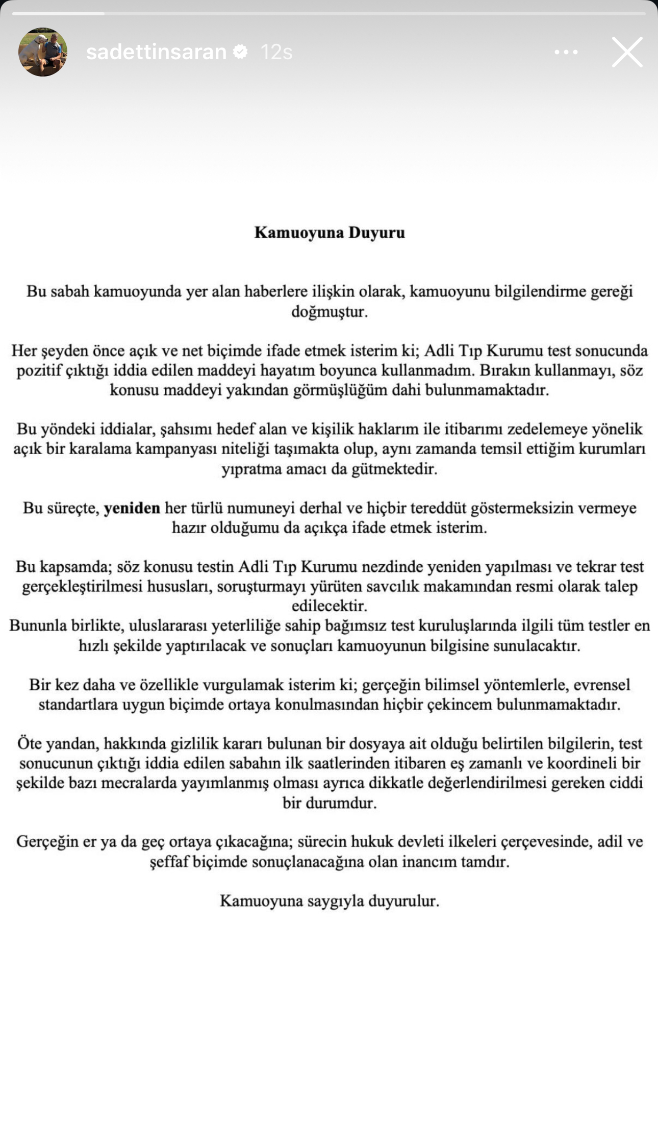 Hakkında yürütülen adli süreç sonrası sosyal medya hesabından yazılı bir açıklama yapan Sadettin Saran, test sonucuna ilişkin iddiaları kesin bir dille reddetti. Saran açıklamasında, Adli Tıp Kurumu testinde pozitif çıktığı öne sürülen maddeyi hayatı boyunca kullanmadığını belirterek, söz konusu iddiaların kendisini ve temsil ettiği kurumları yıpratmaya yönelik olduğunu ifade etti.