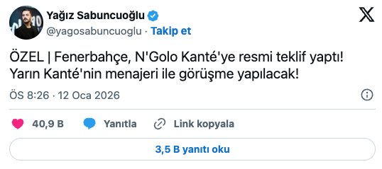 Son dönemde Al Ittihad’dan ayrılmak istediği yönündeki haberlerle gündeme gelen Kante’nin, yeniden Avrupa’da forma giymeye olumlu baktığı ifade ediliyor. Tecrübeli futbolcunun durumu yalnızca Fenerbahçe’nin değil, birçok Avrupa kulübünün de radarında yer alıyor.