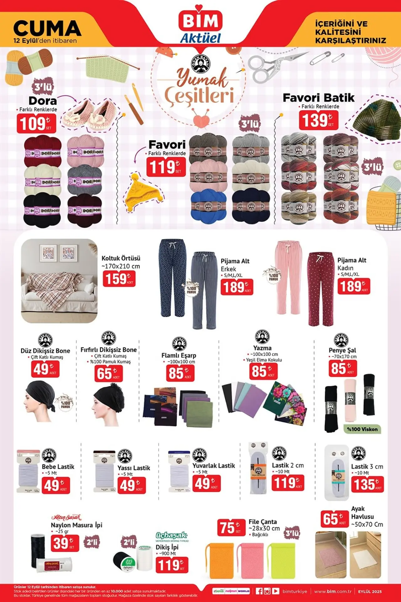 Tekstil ürünlerinde ise Pijama Alt 189 TL, Flamlı Eşarp 85 TL, Penye Şal 85 TL ve Koltuk Örtüsü 159 TL gibi indirimler öne çıkıyor. Ayrıca örgü severler için Yumak Favori 119 TL ve Favori Batik 139 TL fırsatları da katalogda yer alıyor.