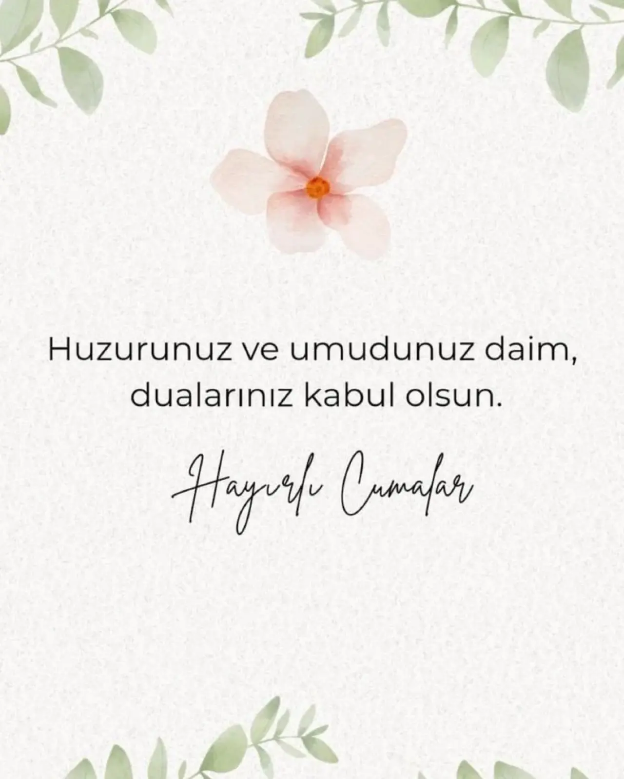 Bu mübarek günde; kalbiniz huzurla, sofranız bereketle, ömrünüz rahmetle dolsun. Sevdiklerinizle birlikte sağlıklı ve mutlu bir ömür geçirmeniz duasıyla… Cumanız mübarek olsun.