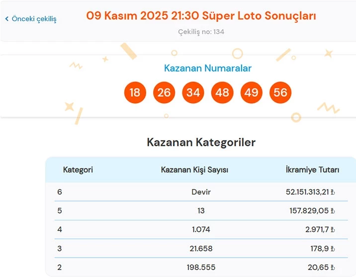 Süper Loto 9 Kasım Pazar sonuçları: 18, 26, 34, 48, 49, 56