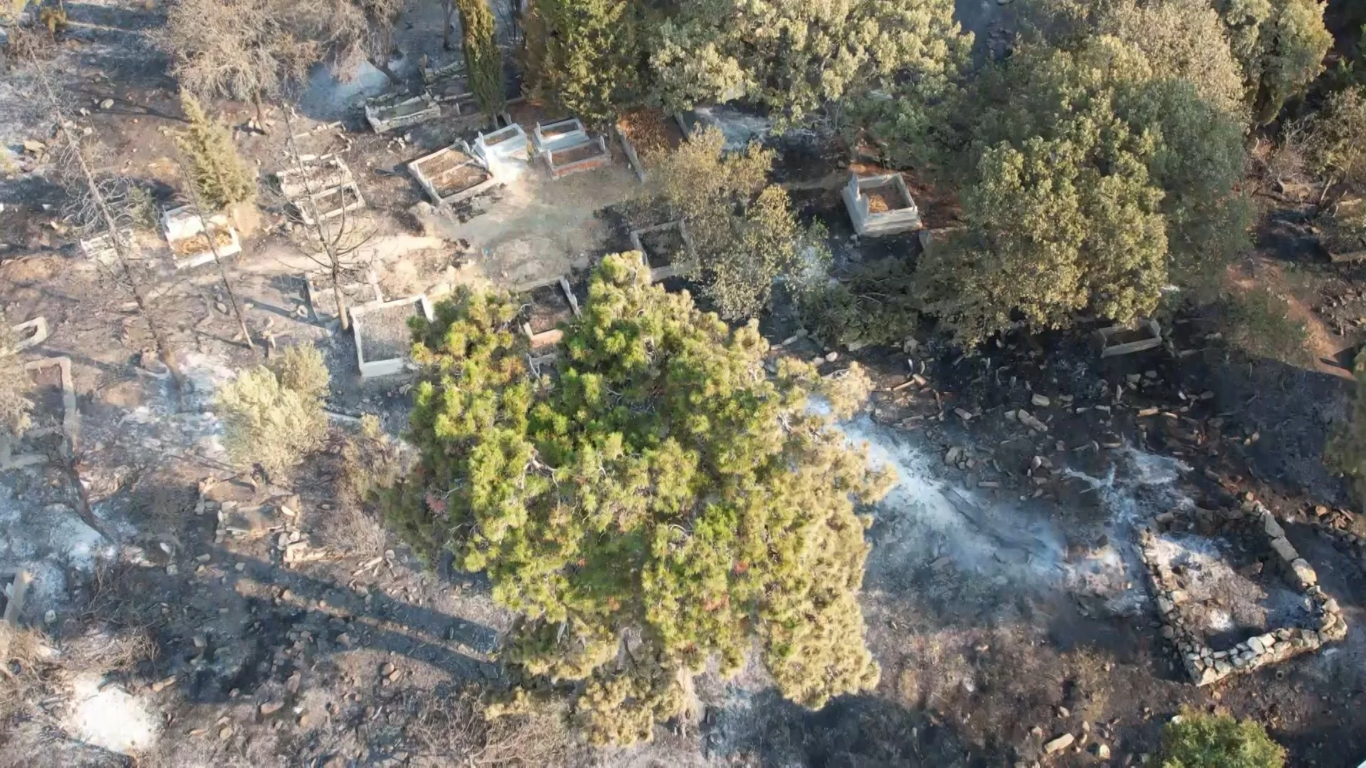Çanakkale’de çıkan orman yangını yerleşim alanlarını da küle çevirdi. Yangında büyük hasar alan Yağcılar Köyü’nde ise mezarlıklar alevlere teslim oldu.
