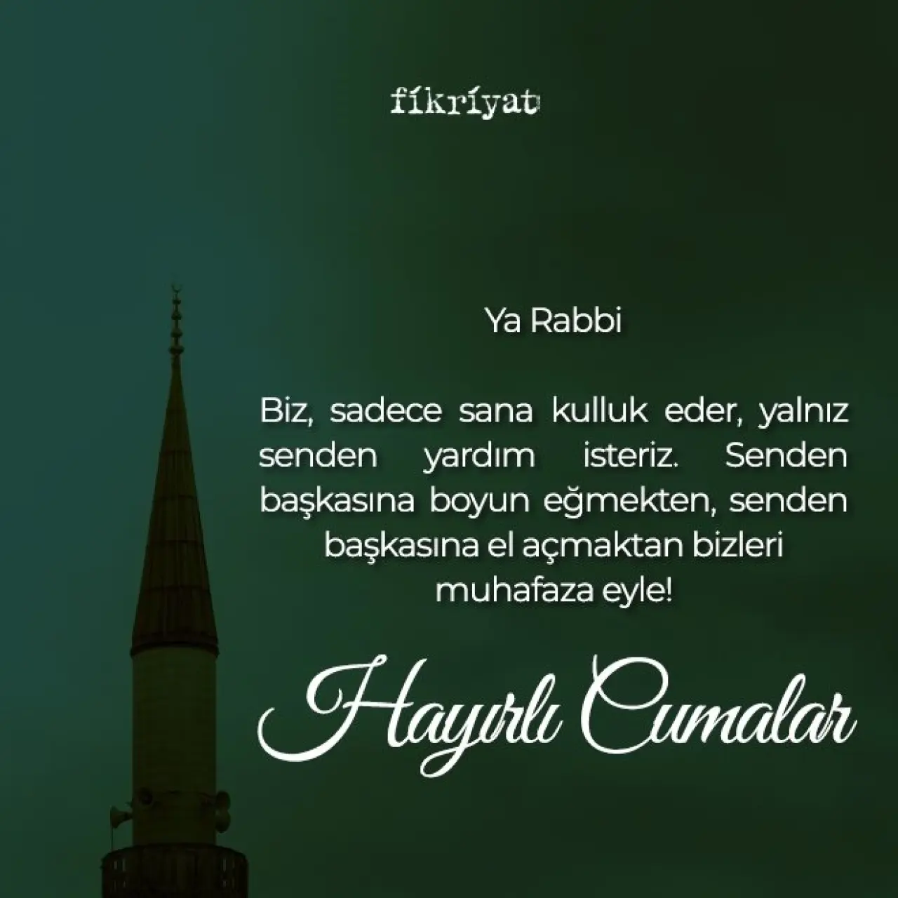 “Ya Rabbi, biz sadece sana kulluk eder, yalnız senden yardım isteriz. Bizleri başkasına boyun eğmekten, başkasına el açmaktan muhafaza eyle!”