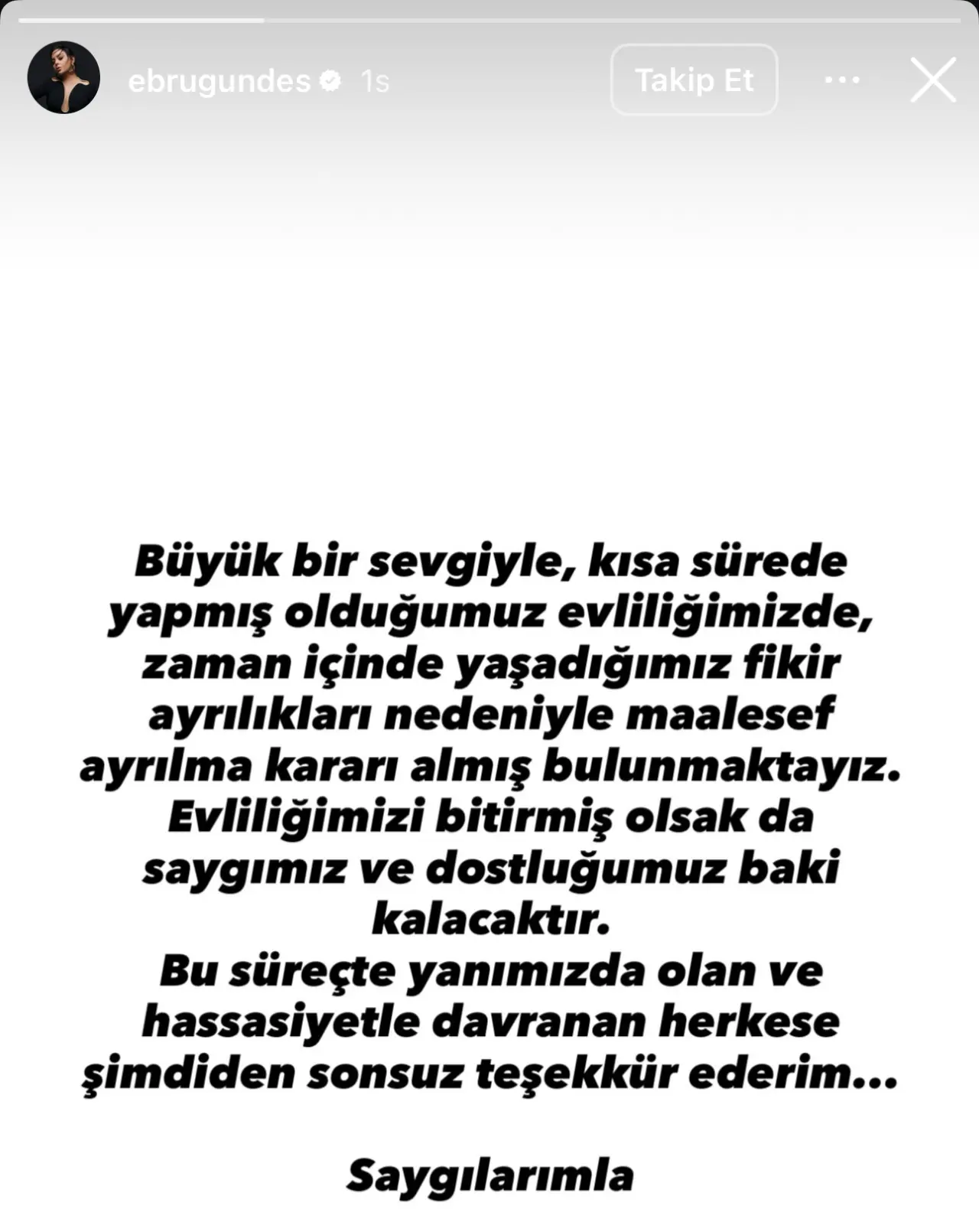 “Büyük bir sevgiyle, kısa sürede yapmış olduğumuz evliliğimizde, zaman içinde yaşadığımız fikir ayrılıkları nedeniyle maalesef ayrılma kararı almış bulunmaktayız. Evliliğimizi bitirmiş olsak da saygımız ve dostluğumuz baki kalacaktır. Bu süreçte yanımızda olan ve hassasiyetle davranan herkese şimdiden sonsuz teşekkür ederim… Saygılarımla.”