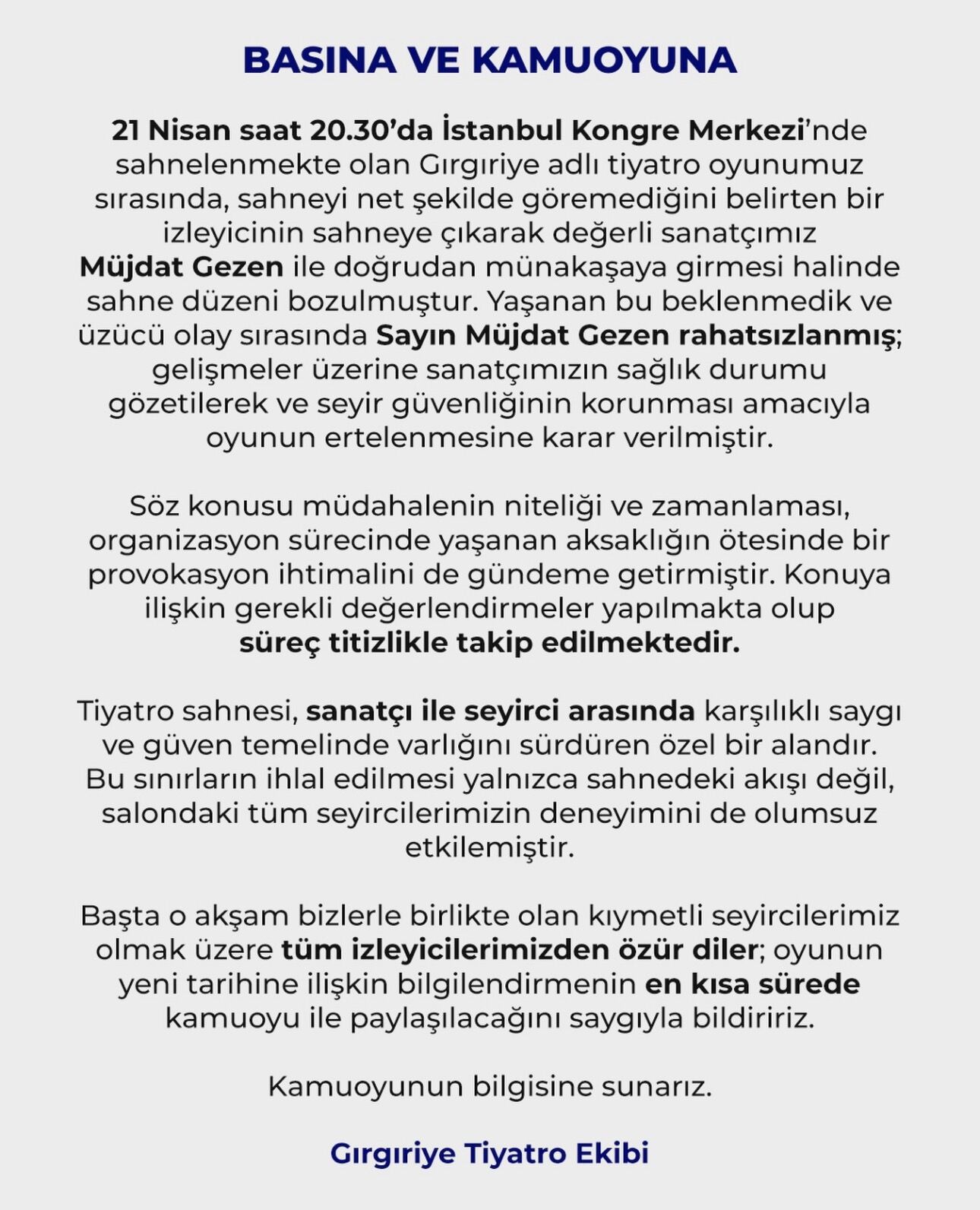 Gırgıriye müzikalinde seyirciyle yaşanan gerginlik sonrası oyun yarıda kaldı. Müjdat Gezen sağlık sorunu yaşayarak hastaneye kaldırıldı.