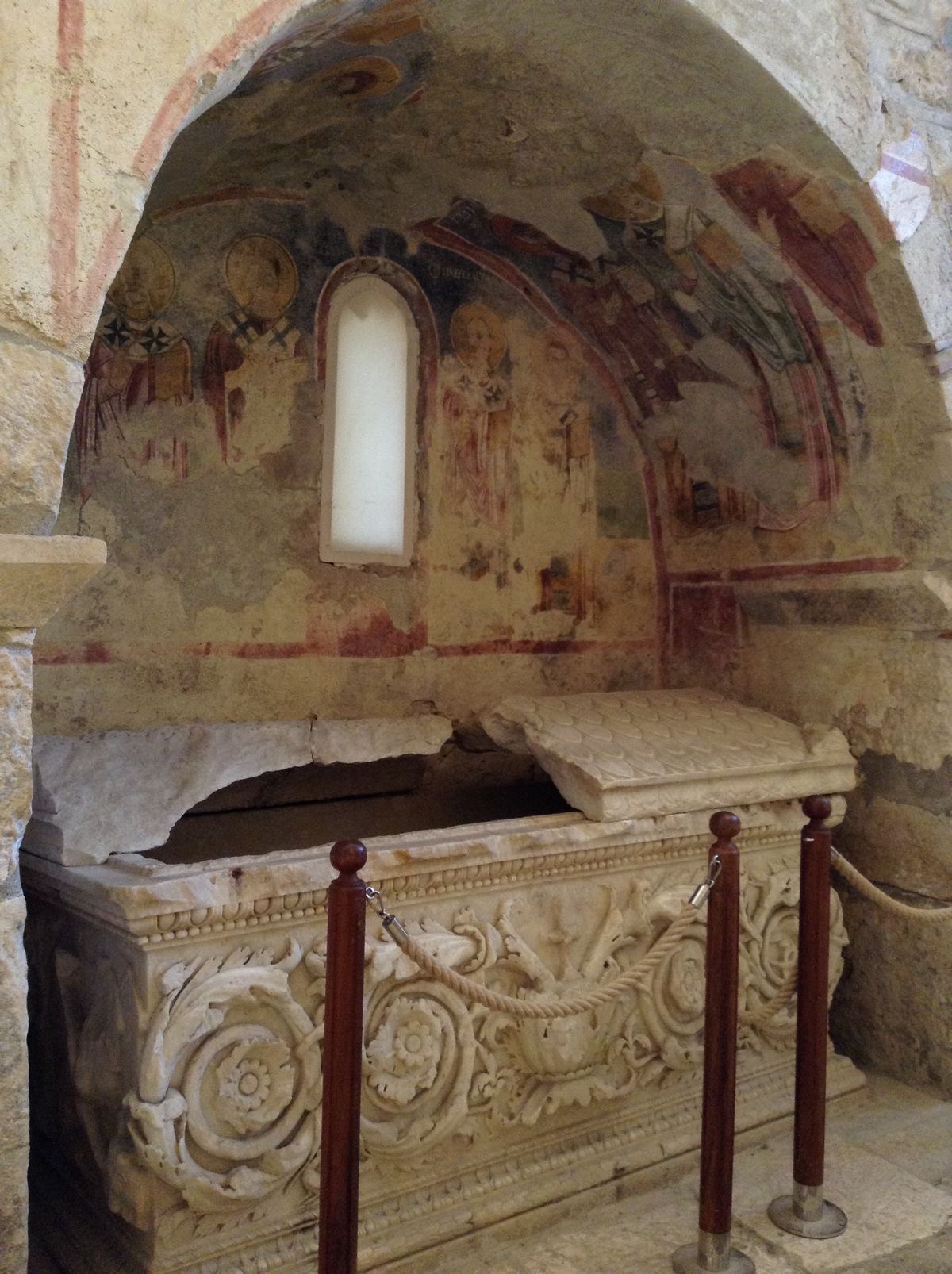 Ortaçağ döneminde bazı kaynaklarda Nikolaos’ın kemiklerinin Bari’ye götürüldüğü yazsa da modern tarihçiler bu aktarımın yalnızca “relic” yani kutsal kalıntı geleneğiyle ilişkili olduğuna dikkat çekmektedir. Bari’ye taşınan kemiklerin tamamının Aziz Nikolaos’a ait olup olmadığı kesin değildir. Buna karşın Demre’deki kilise, piskoposun ölümünden hemen sonra oluşturulan orijinal gömü alanıdır ve tarihsel süreklilik açısından “gerçek mezarın bulunduğu yer” olarak kabul edilmektedir.