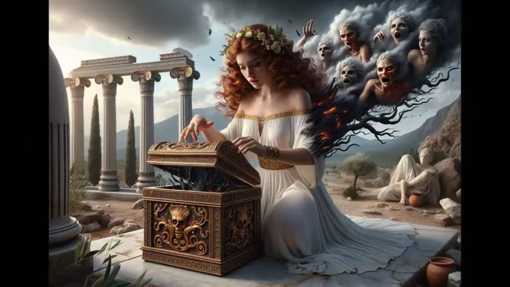 Antik yazar Hesiodos’un aktardığına göre Pandora, Epimetheus’un yanına getirilmiş ve kendisine verilen bu hediye, açılmaması gereken bir uyarıyla birlikte teslim edilmiştir. Ancak Pandora’nın merak duygusu, efsanenin seyrini değiştiren unsurdur. Efsanede Pandora’nın kutuyu açmasıyla birlikte insanlara ait olmayan tüm kötülüklerin dünyaya yayıldığı anlatılmaktadır. Hastalıklar, kıtlık, kıskançlık, acı ve çeşitli felaketlerin kutudan çıkarak insan hayatına dahil olduğu belirtilmektedir. Bu durum, antik mitolojide insanlığın neden zor koşullarla karşılaştığını açıklamak amacıyla kullanılan sembolik bir anlatım olarak öne çıkar.