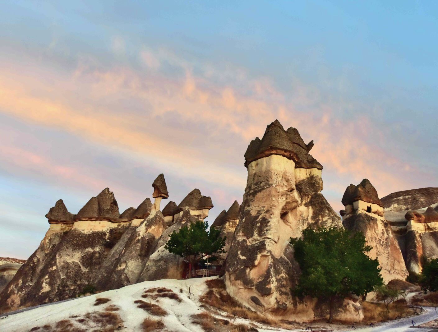 Paşabağları’nda yer alan peri bacaları, yalnızca doğal bir oluşum değil, aynı zamanda insanın doğayla kurduğu ilişkinin bir sembolü. Bazı peri bacaları tek, bazıları ise iki ya da üç gövdeli olarak yükseliyor. Yumuşak tüf katmanlarının arasında daha sert kaya tabakalarının bulunması, bu “mantar şapka” görünümünü oluşturuyor. Zamanla oyulan bacalar, içlerinde yaşam alanı, depo, şapel ve inziva hücresi olarak kullanılmış. Bölge bugün açık hava müzesi niteliğinde gezilebiliyor. Ziyaretçiler, doğal yürüyüş yollarında ilerlerken tarih öncesi dönemlerden günümüze uzanan izleri hissedebiliyor. Sabah saatlerinde güneşin ilk ışıklarıyla parlayan tüf kayaları, gün batımında ise kızıl bir renge bürünerek görsel bir şölen sunuyor.
