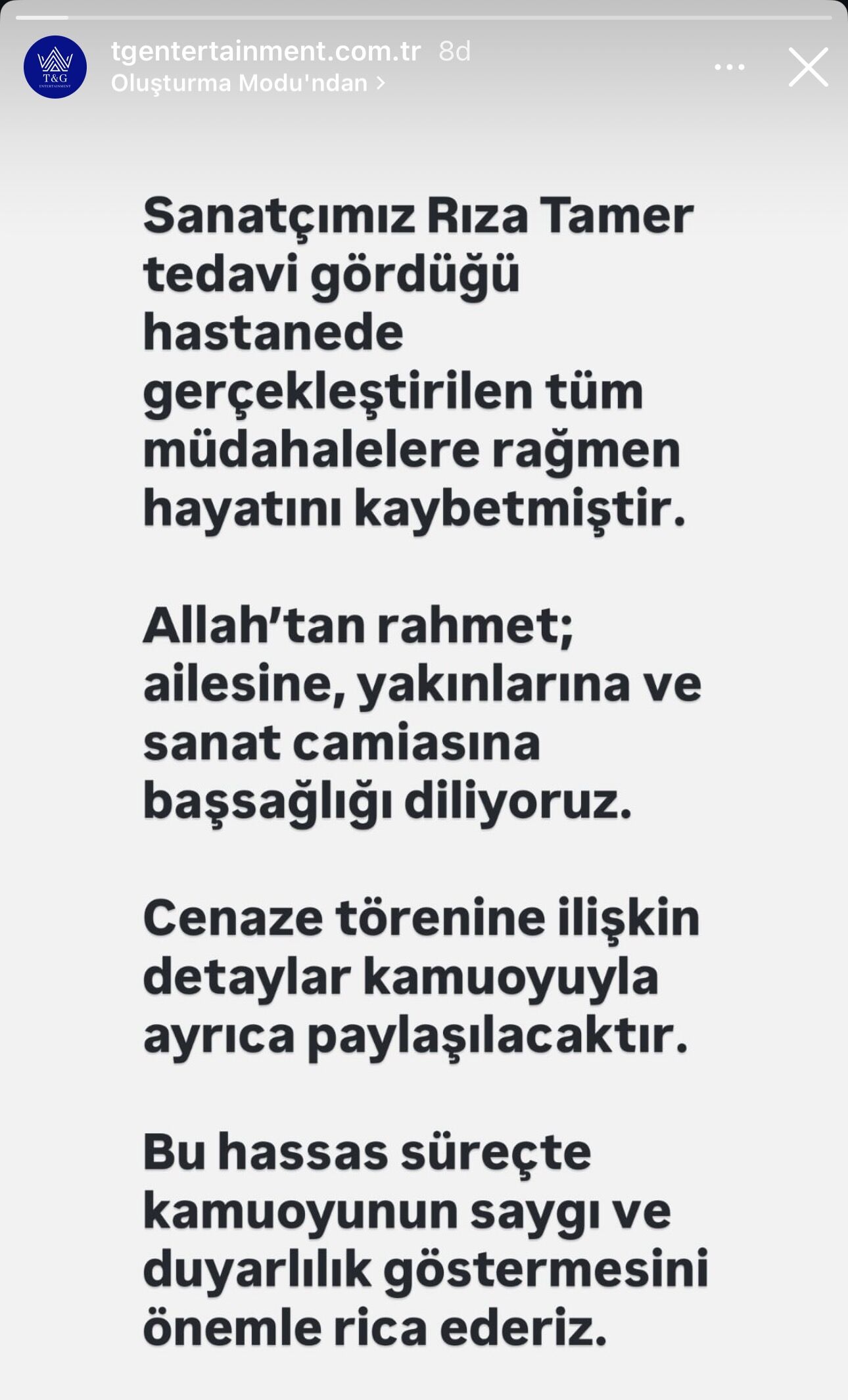 Sanatçının vefat ettiği, tedavi gördüğü hastanede yapılan tüm müdahalelere rağmen hayatını kaybettiği bilgisi menajerlik şirketi tarafından kamuoyuna duyuruldu. Yapılan açıklamada, “Sanatçımız Rıza Tamer, tedavi gördüğü hastanede gerçekleştirilen tüm müdahalelere rağmen hayatını kaybetmiştir. Ailesine, yakınlarına ve sanat camiasına başsağlığı diliyoruz. Cenaze törenine ilişkin detaylar kamuoyuyla ayrıca paylaşılacaktır” ifadelerine yer verildi.