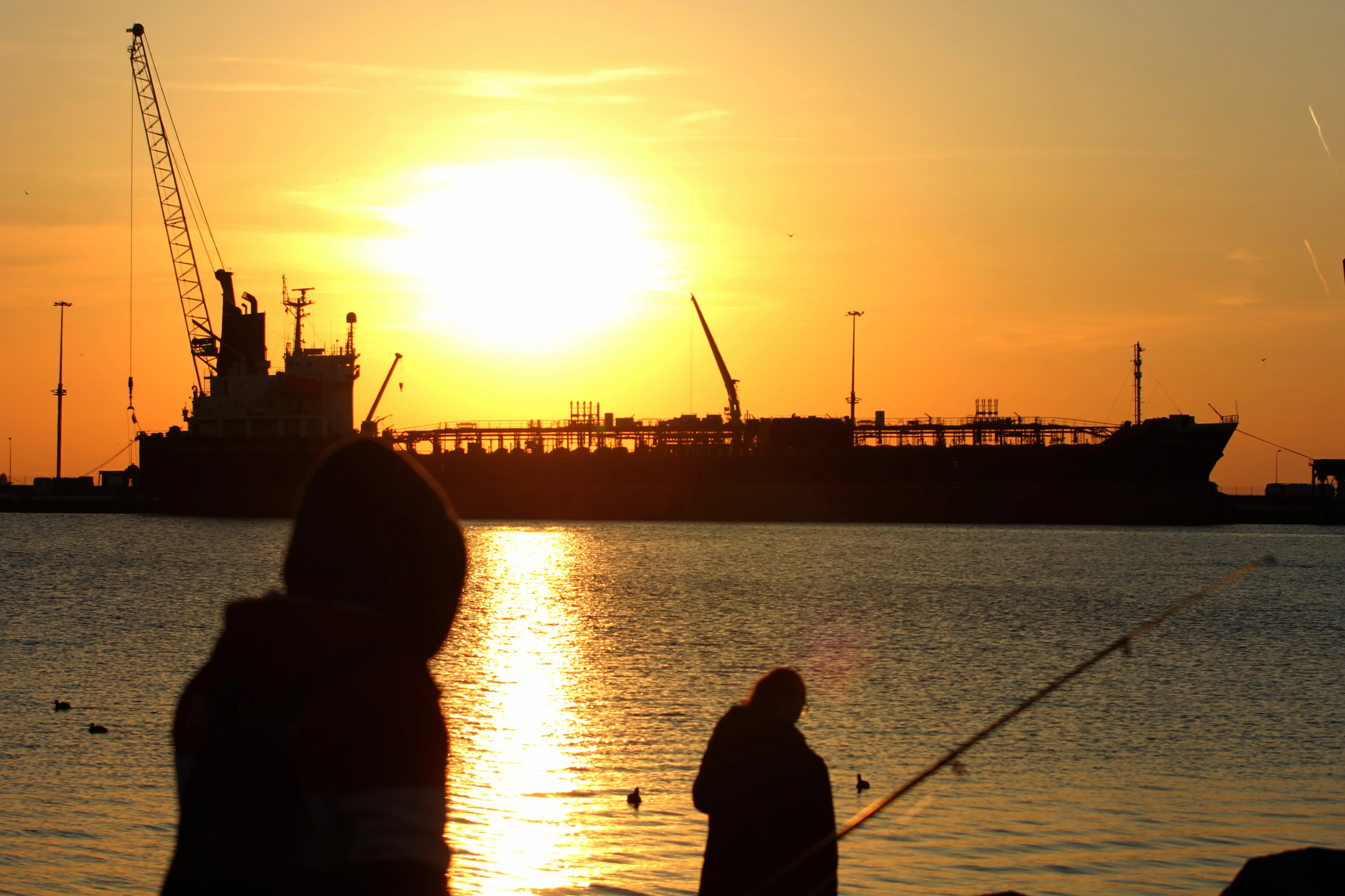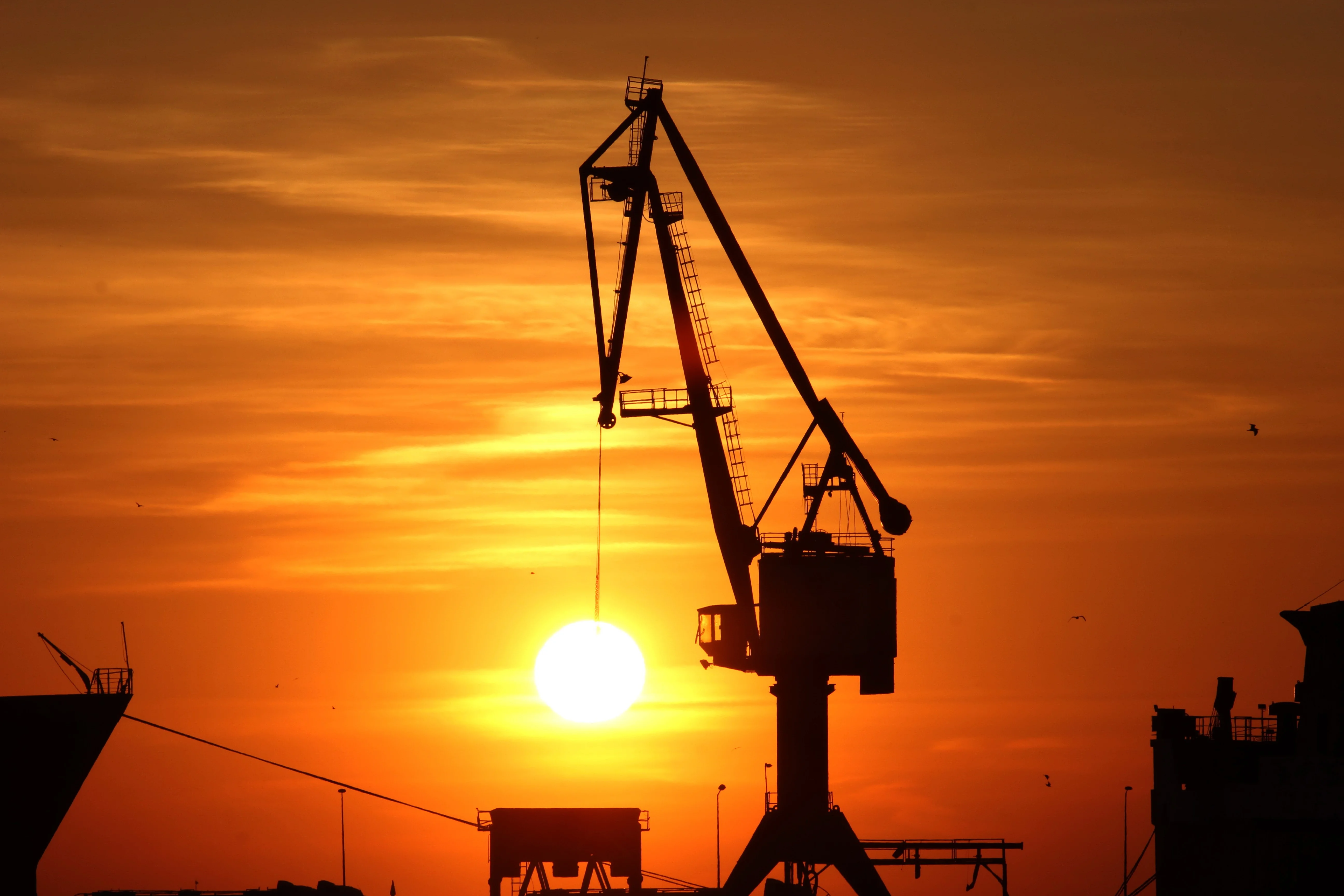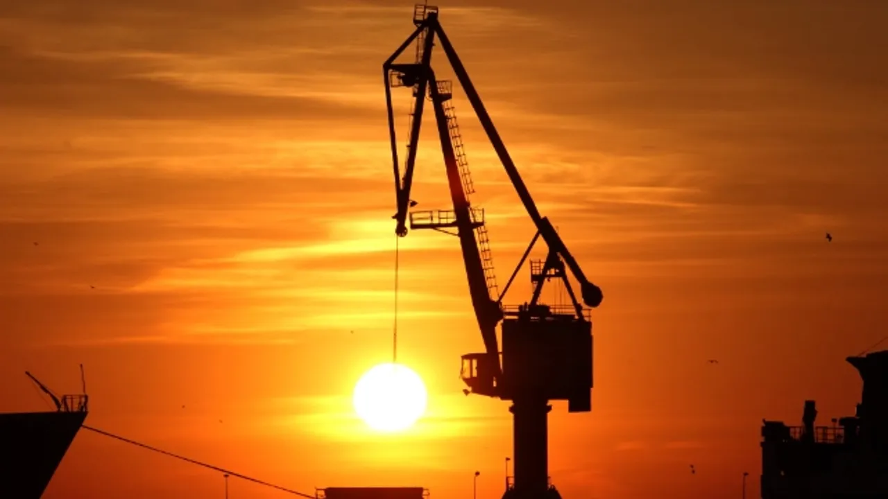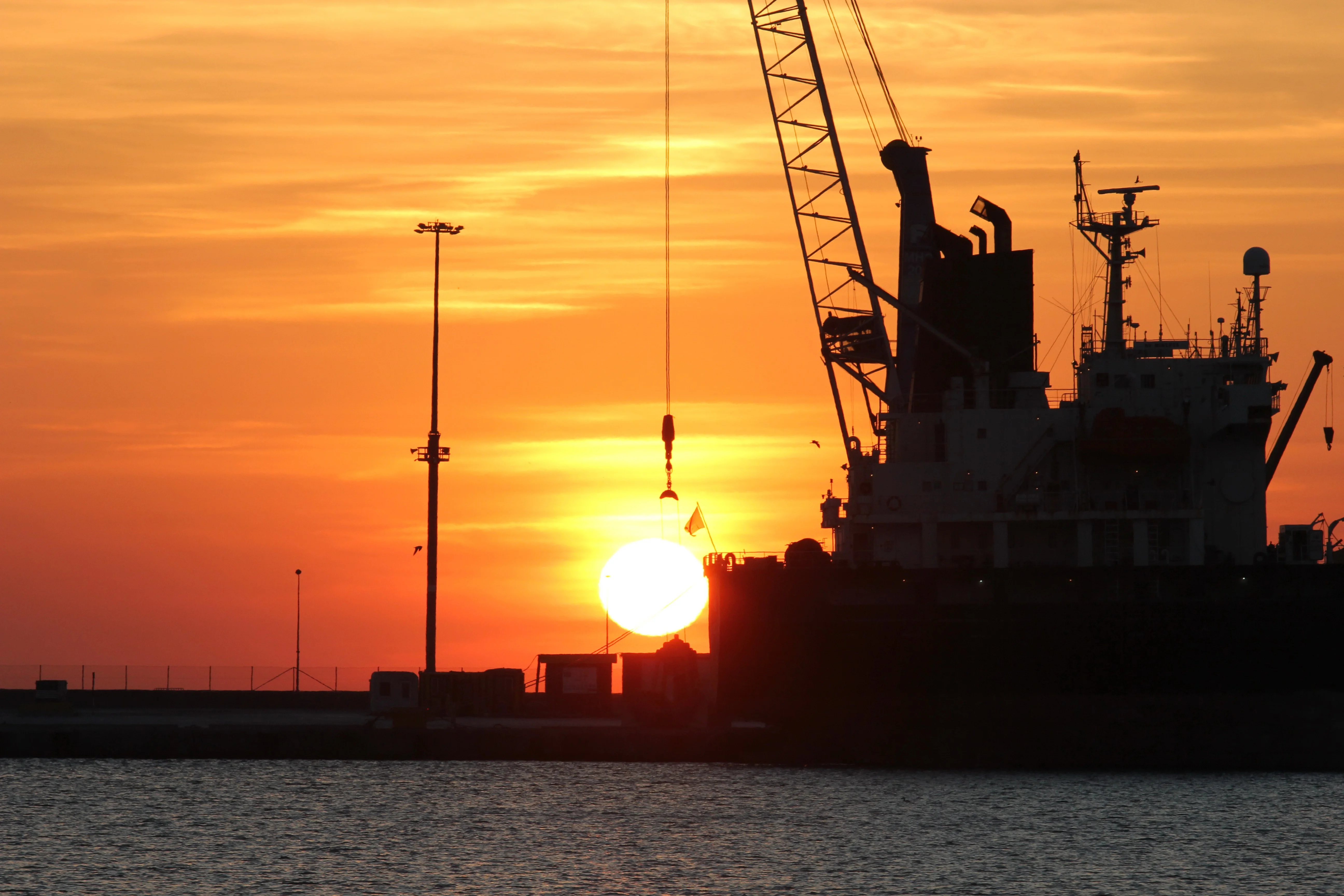 Gün doğumunun kızıllığı denizi aydınlatırken, ışıkların limandaki vinçlerle kesişmesi ortaya ilginç bir görüntü çıkarıyor.