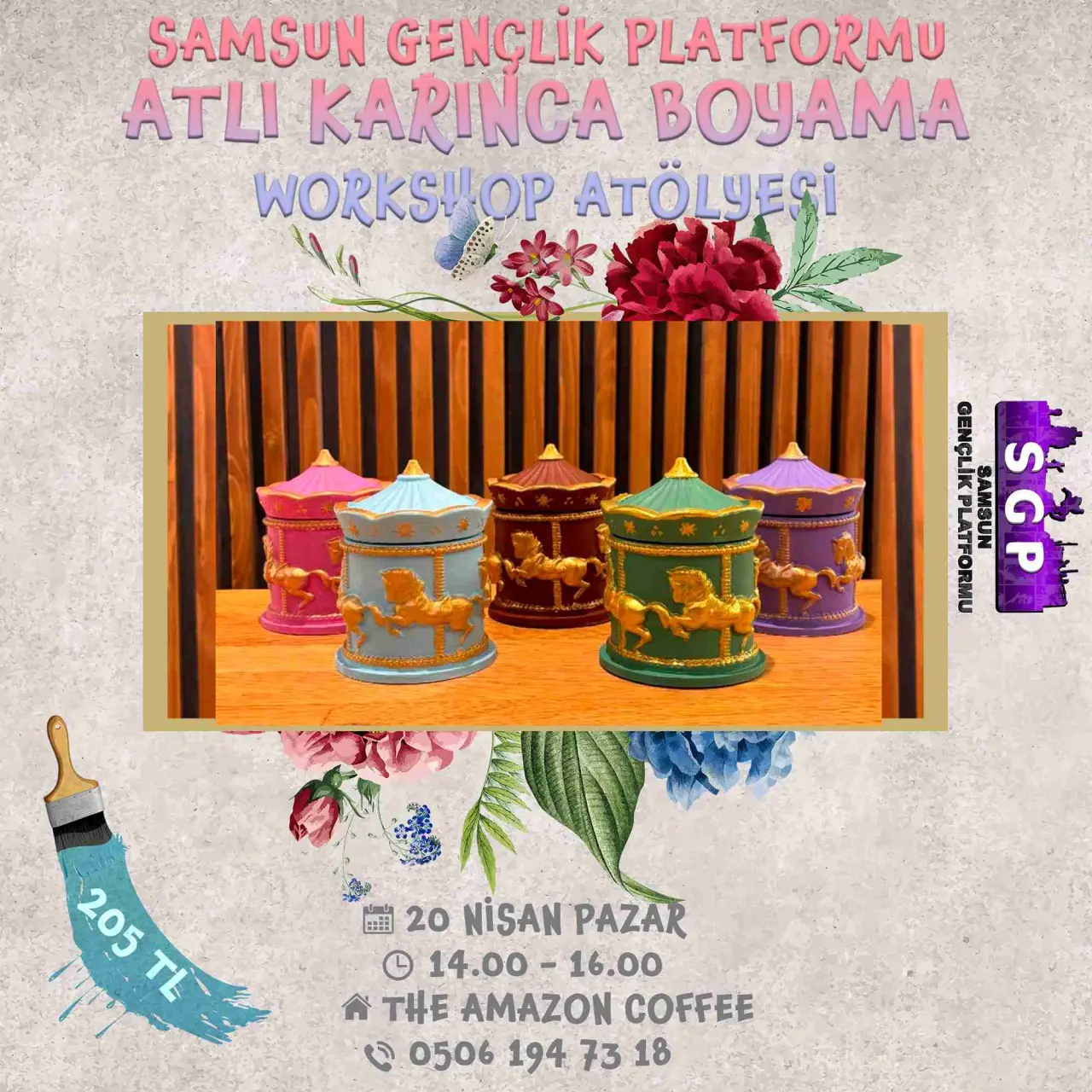 Samsun Gençlik Platformu, gençler için çeşitli sanat atölyeleri düzenliyor. Kil-heykel yapımı, mantar ev boyama ve atlı karınca boyama gibi etkinliklerle gençlerin yaratıcılıklarını geliştirmelerine yardımcı oluyor. Etkinlikler, sosyal medya üzerinden duyuruluyor ve katılımcılar için eğlenceli deneyimler sunuyor.