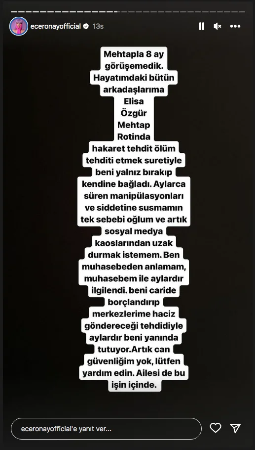 Mehtapla 8 ay gõrüşemedik. Hayatımdaki bütün arkadaslarımla Elisa,Özgür,Mehtap, Rotinda hakaret tehdit ölüm tehditi etmek suretiyle beni yalnız birakip kendine bağladı.