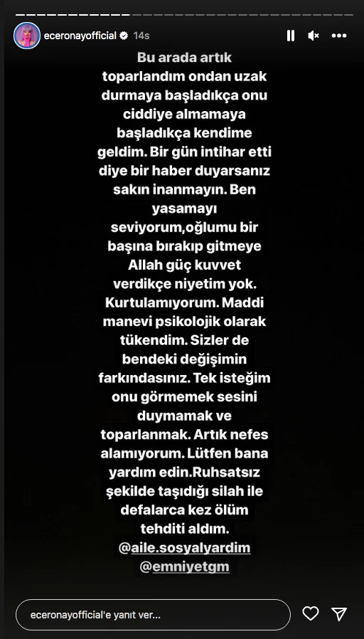 Ben yasamayı seviyorum,oğlumu bir basina birakip gitmeye Allah güç kuvvet verdikçe niyetim yok. Kurtulamıyorum. Maddi manevi psikolojik olarak tükendim. Sizler debendeki değişimin farkındasınız. Tek isteğim onu görmemek sesini duymamak ve toparlanmak. Artık nefes alamıyorum. Lütfen bana yardım edin.Ruhsatsız şekilde taşıdığı silah ile defalarca kez ölüm tehditi aldım.