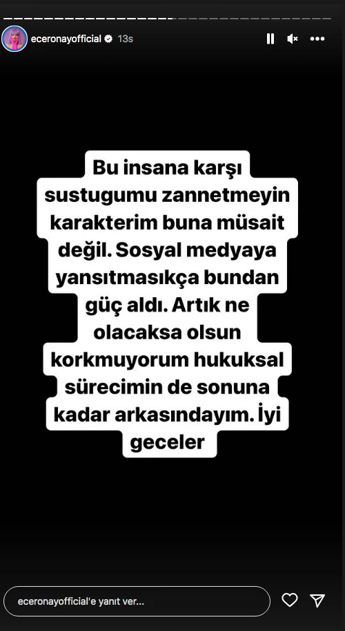 Bu insana karşı sustugumu zannetmeyin karakterim buna müsait degil. Sosyal medyaya yansıtmasıkça bundan güç aldı. Artik ne olacaksa olsun korkmuyorum hukuksal sürecimin de sonuna kadar arkasındayım. İyi geceler.