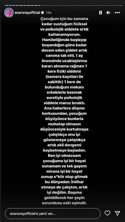 Canıma Tak etti diyerek açıklamada bulunan Ronay "Çocuğum için bu zamana kadar sustuğum fiziksel ve psikolojik siddete artık katlanamıyorum.