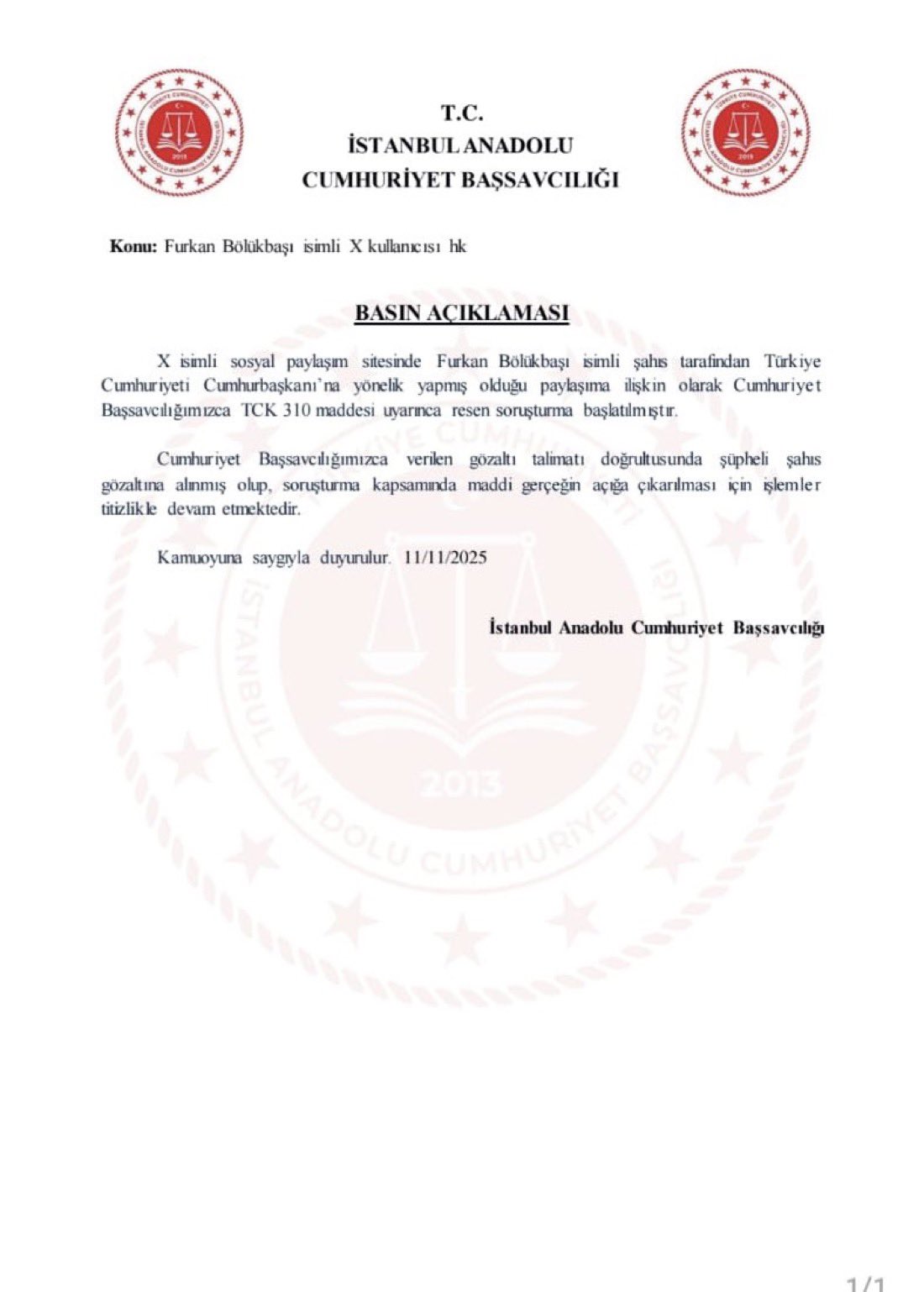 Furkan Bölükbaşı, Cumhurbaşkanına yönelik paylaşımı nedeniyle “suikast ve tehdit” suçlamasıyla gözaltına alındı.