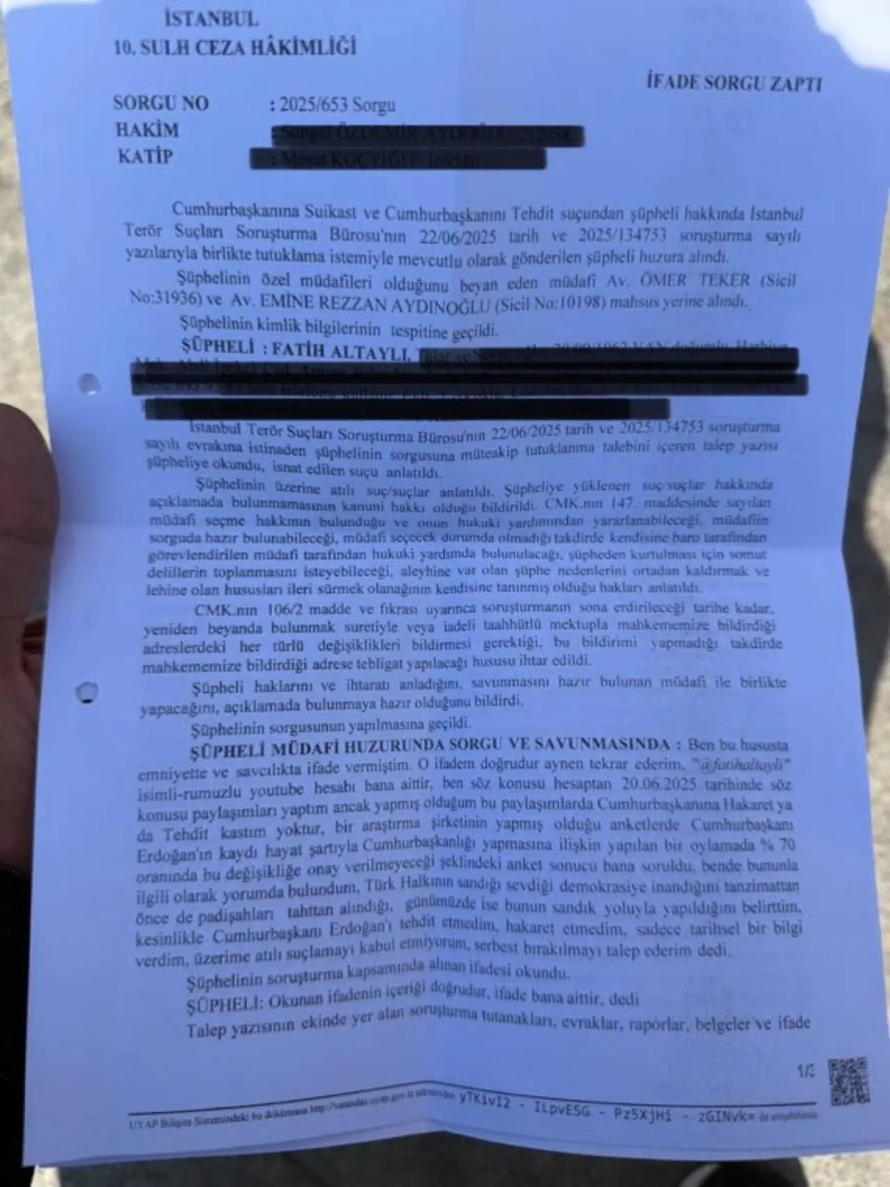 İstanbul Cumhuriyet Başsavcılığı tarafından re’sen başlatılan soruşturma kapsamında gözaltına alınan Altaylı, bugün adliyeye sevk edildi. Söz konusu yayınında Cumhurbaşkanı Erdoğan’a yönelik tehdit içerdiği öne sürülen ifadeler kullandığı iddiasıyla hakkında TCK 310/2 ve 106/1. maddeleri uyarınca işlem yapıldı.
