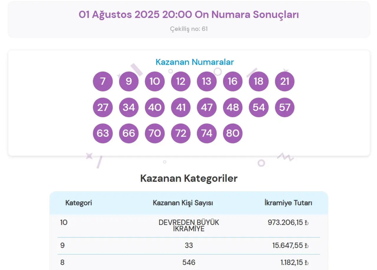 1 Ağustos 2025 Cuma On Numara Çekiliş Sonuçları