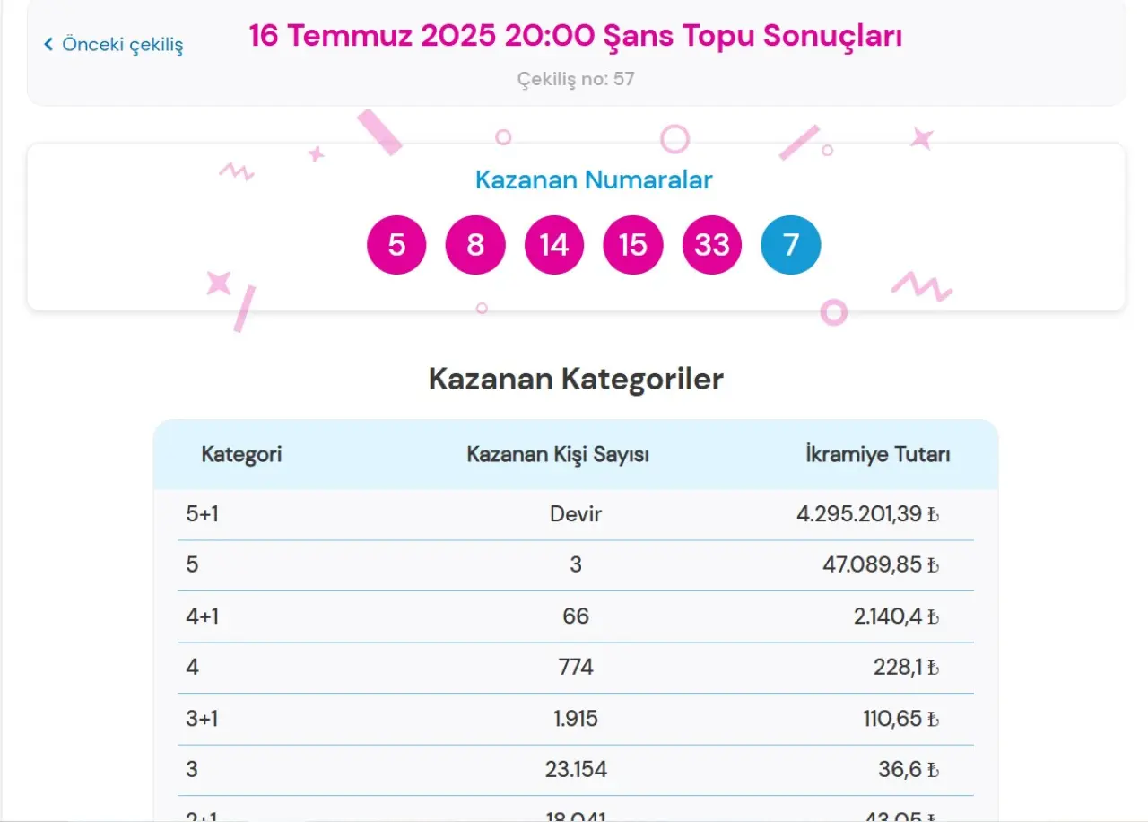 13 Temmuz 2025 Çarşamba akşamı yapılan çekilişte yaklaşık 2 milyon TL devretmişti ve son 3 günde biriken tutarla birlikte büyük ikramiye 4,3 milyon liraya ulaşsa da yine kazanan çıkmadı. İkramiye dağılımları şu şekilde gerçekleşti: