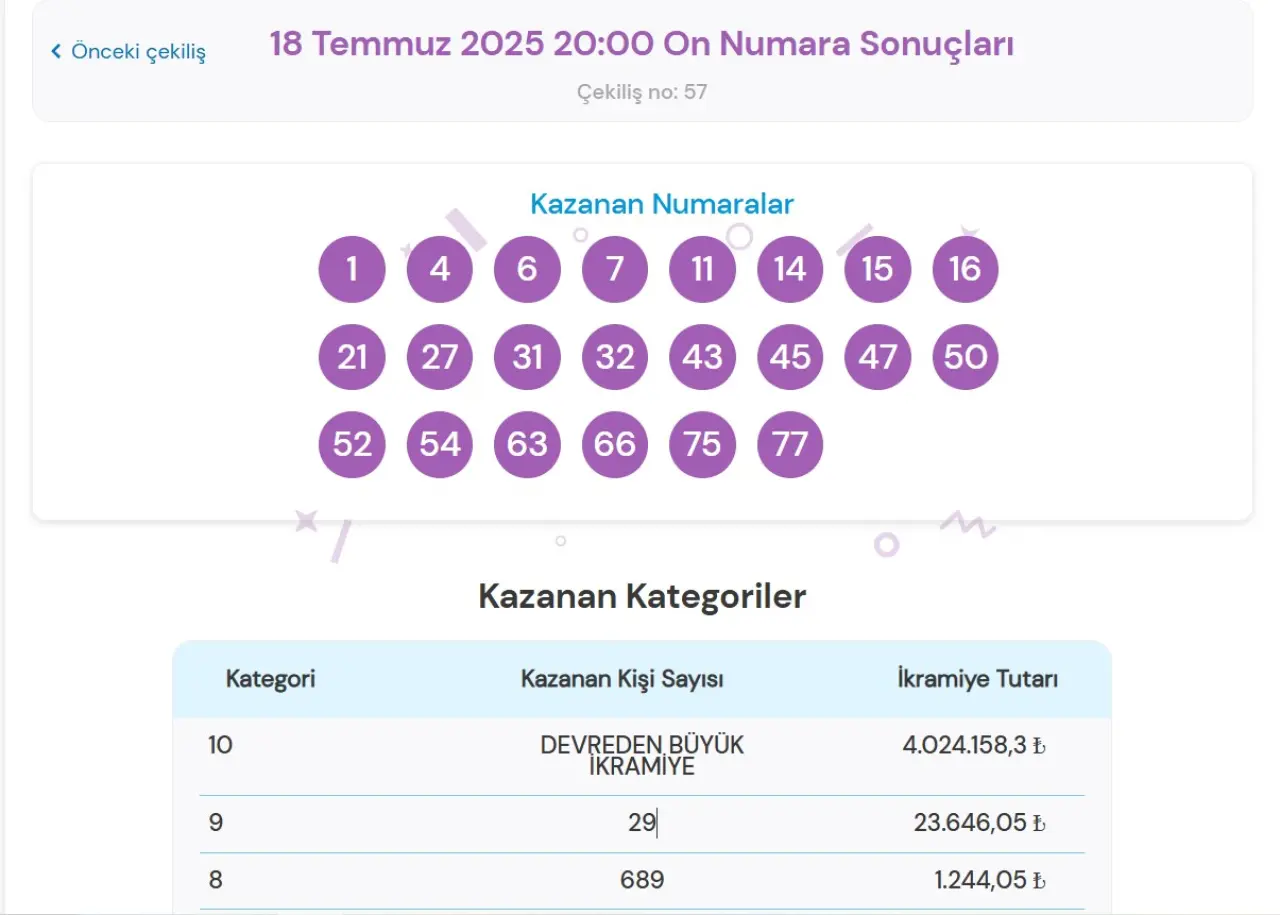 18 Temmuz 2025 Cuma On Numara Sonuçları