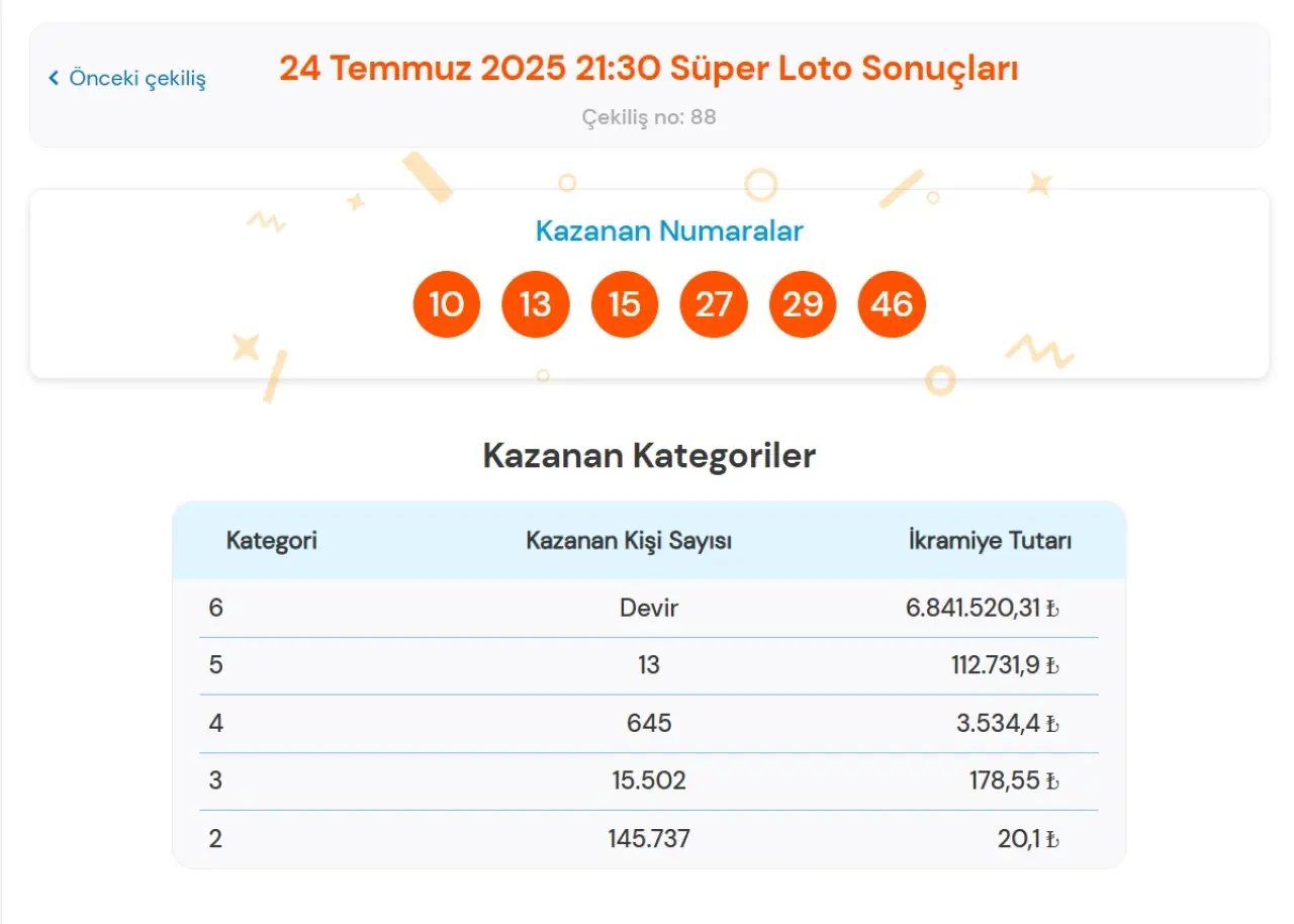 Süper Loto’da 24 Temmuz 2025 Perşembe günü saat 21.30’da yapılan çekilişte dağıtılan ikramiyeler şu şekilde oldu: