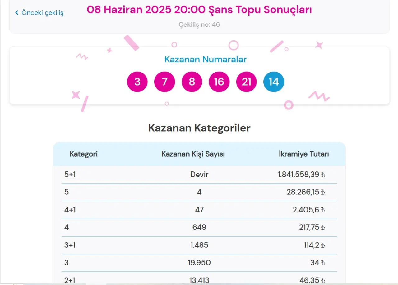 8 Haziran 2025 Şans Topu Çekilişi Sayıları