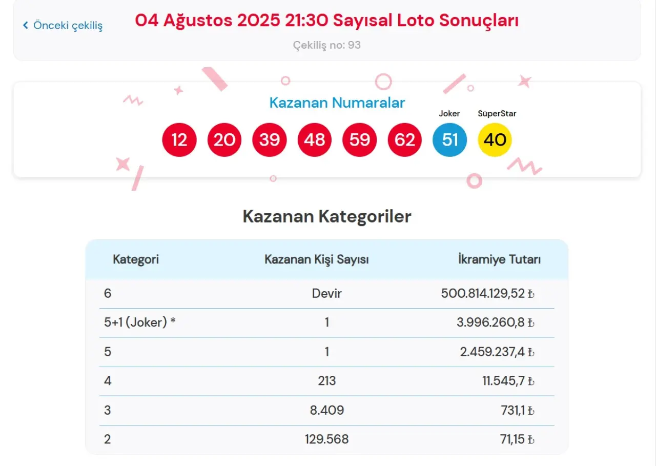 4 Ağustos 2025 Çılgın Sayısal Loto Çekiliş Sonucu