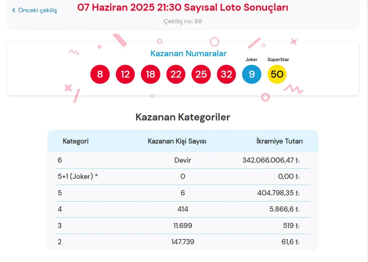 Milli Piyango İdaresi tarafından çekilişi yapılan oyunlar arasında en büyük ikramiyeyi Çılgın Sayısal Loto vermekte. 2025 yılının 68.Çılgın Sayısal Loto çekilişi 7 Haziran Cumartesi akşamı yapıldı. 4 Haziran Cumartesi günü devreden 336 milyon TL’lik büyük ikramiye, bu çekilişte 342 milyon liranın üzerine çıktı. Ancak bu çekilişte de büyük ikramiyeyi kazanan kimse çıkmadı ve 342 milyon TL bir sonraki çekilişe devretti.