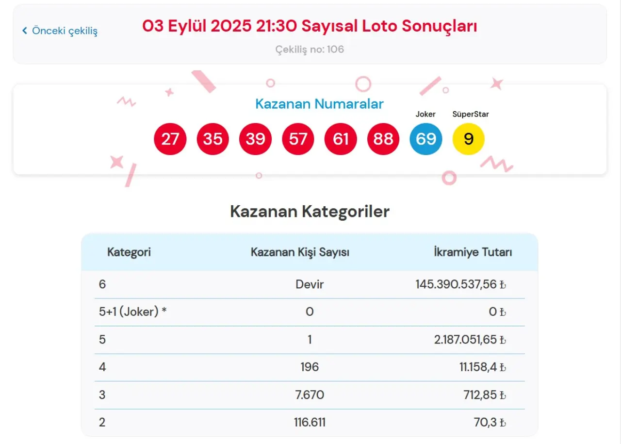 3 Eylül 2025 Çılgın Sayısal Loto Çekilişi Sonuçları