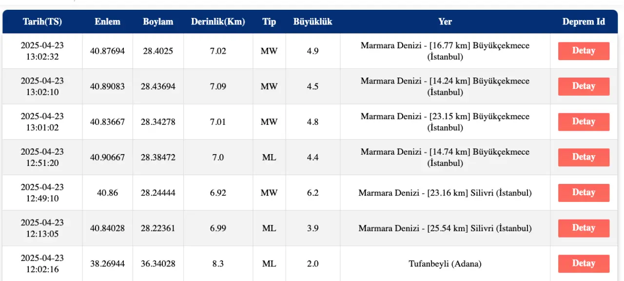 Afet ve Acil Durum Yönetimi Başkanlığı, son depremlerin verilerini şu şekilde paylaştı:
