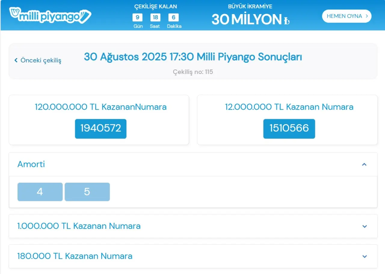 Milli Piyango İdaresi tarafından genellikle her ayın 9’u, 19’u ve 29’unda gerçekleştirilen çekilişler, özel günler ve bayramlarda farklı tarihlerde konumlandırılabiliyor. Bu doğrultuda, Ağustos ayının son çekilişi 30 Ağustos 2025 Cumartesi günü Zafer Bayramı özel çekilişi olarak gerçekleştirildi. Ağustos ayındaki diğer çekilişler de, bu çekiliş sebebiyle iptal edilmişti. “Normal” çekilişlerde belirlenen 30 milyon liralık büyük ikramiye rakamı, bu çekilişe özel olarak 120 milyon TL seviyesinde belirlendi. İşte çekilişin sonuçları ve ikramiye kazanan numaralar…