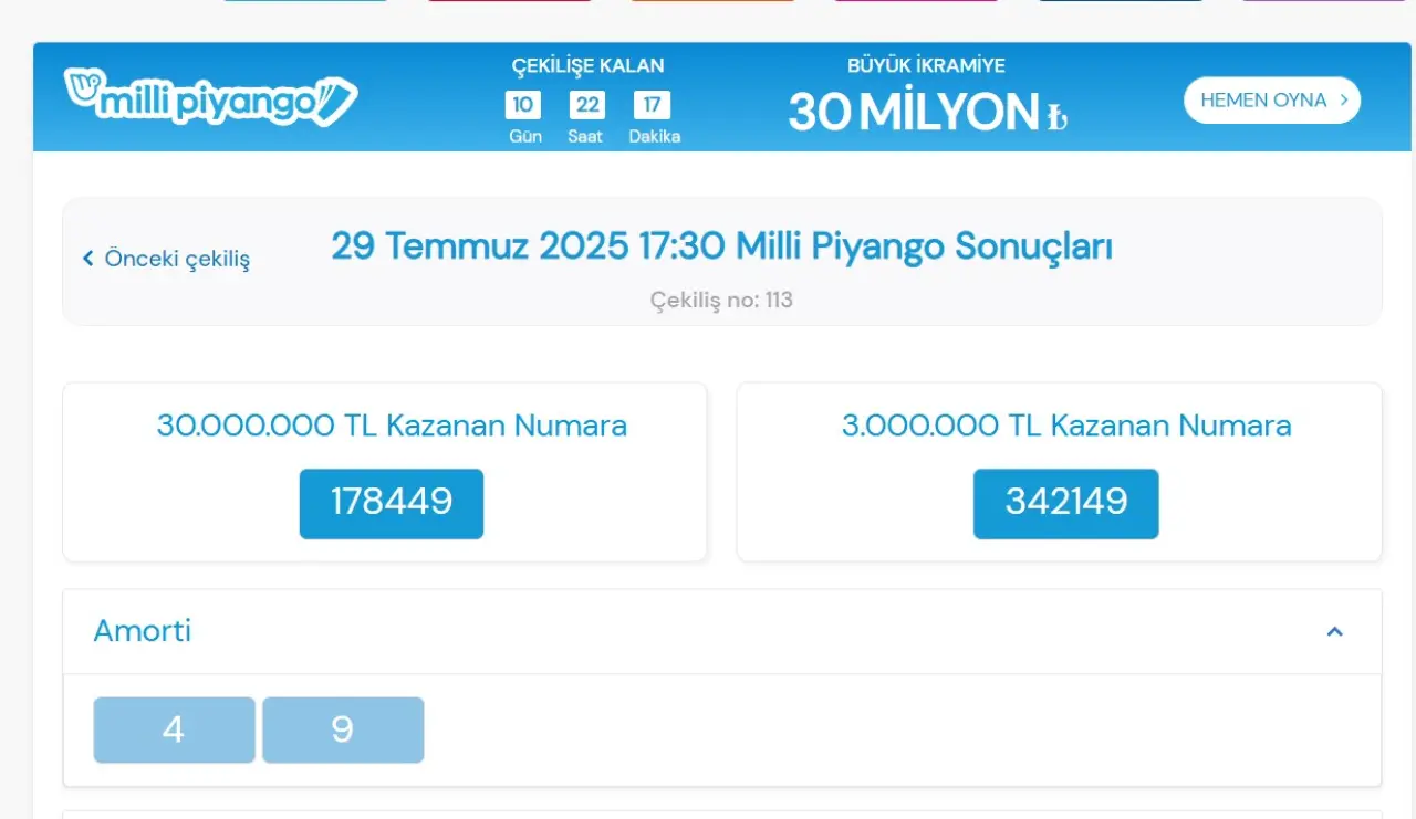29 Temmuz Milli Piyango çekilişleri saat 17.30 itibariyle yapıldı. 30 milyon liralık büyük ikramiye 178449 numaralı bilete çıkarken, 3 milyon liralık ikramiye ise 342149 numaralı bilet sahibine isabet etti. Çekilişte amorti rakamları 4 ve 9 olarak belirlendi. İşte çekilişe dair tüm detaylar…