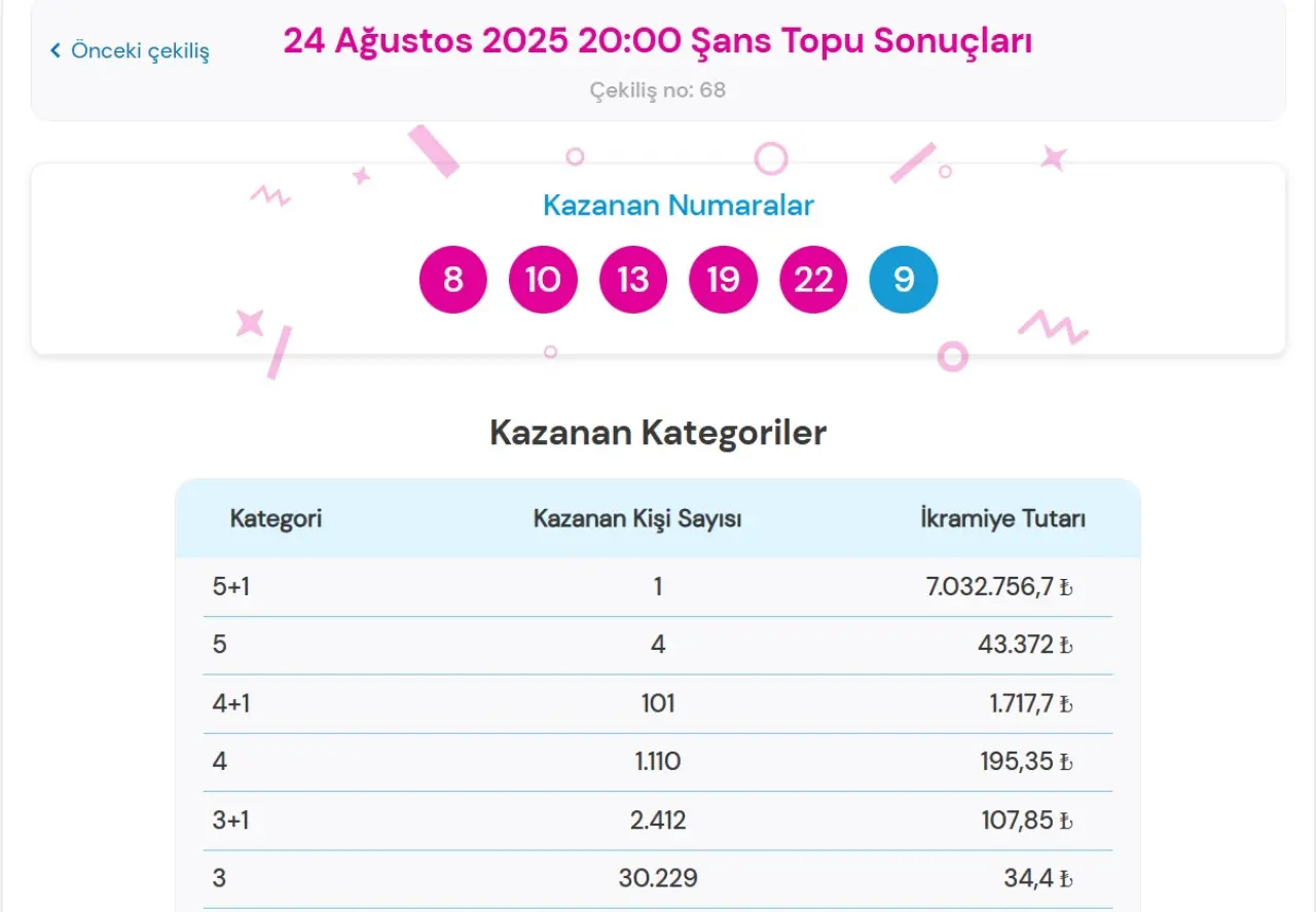5+1 olarak da bilinen Şans Topu çekilişinde dün akşam haftanın son çekilişi gerçekleştirildi. 2025 yılının 68. çekilişi olan Şans Topu’nun 24 Ağustos 2025 Pazar günü ki çekilişinde, son 2 çekiliştir devreden tutar ile birlikte büyük ikramiye meblağı 7 milyon liranın üzerine çıktı. Bu çekilişte ise yeni bir devir yaşanmadı ve 1 talihli büyük ödülü kazandı.