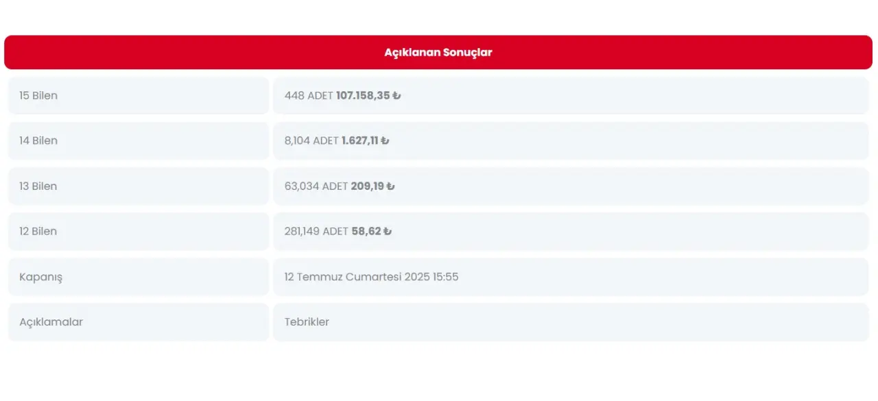 Spor Toto’da bu haftanın maçları tamamlandı. Büyük sürprizlerin yaşanmadığı haftada 15’i tam 448 kişi bildi. 2 hafta üst üste devrettiği için 3. haftada 50 milyon lira seviyesine dayanan ikramiye tutarı tam 448’e bölündü. Böylece söz konusu 448 kişi adam başına 107’şer bin lira ikramiye almayı hak etti. Devir ikramiyesi olmayan 14, 13 ve 12’de ise talihliler çok daha mütevazı rakamlar elde edebildi.