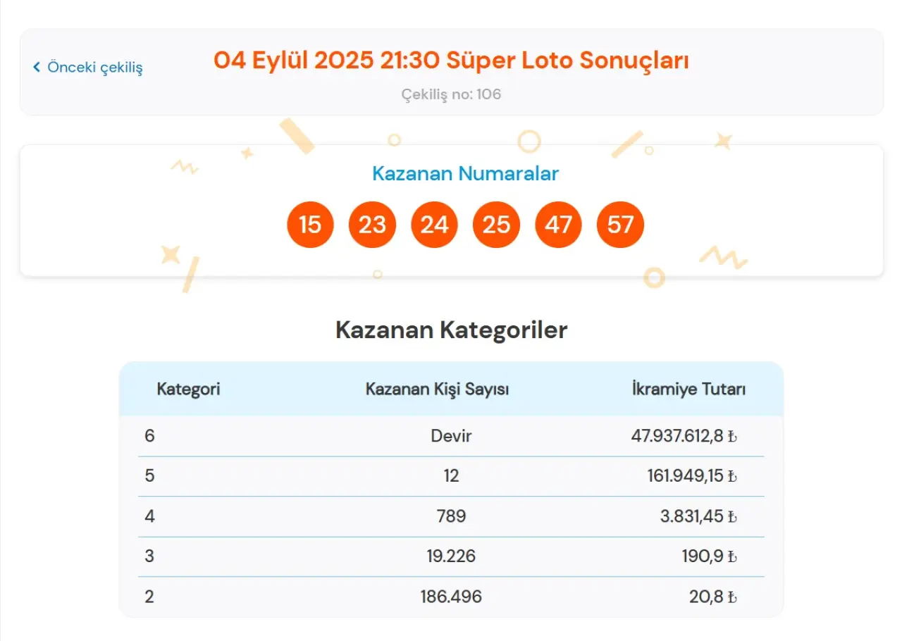 4 Eylül 2025 Perşembe akşamı saat 21.30’da Süper Loto çekilişi gerçekleştirildi. Milli Piyango İdaresi tarafından yapılan 2025 yılının 106. Süper Loto çekilişinde, tıpkı geçtiğimiz haftalarda olduğu gibi yine büyük ikramiyeyi bilen çıkmadı. Ağustos ayının sonundan bu yana devam eden devir serisi bu çekilişte de sürdü. 48 milyon TL seviyesine yaklaşan ikramiye bir sonraki çekilişe kaldı; işte talihli rakamlar ve diğer ikramiye dağılımları…