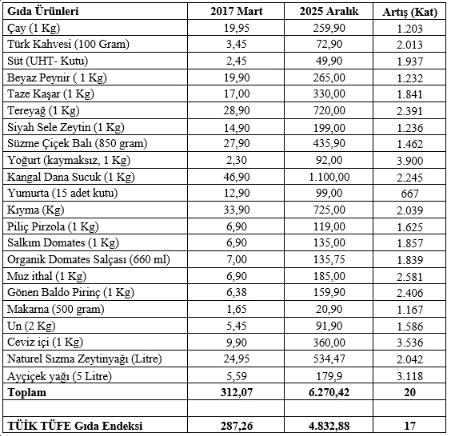 Eğilmez, hazırladığı tabloda market sepetindeki toplam gıda fiyatlarının 9 yılda yaklaşık 20 kat yükseldiğini ifade ederken, aynı dönemde TÜİK’in açıkladığı TÜFE Gıda ve Alkolsüz İçecekler endeksinin 17 kat artış gösterdiğine dikkat çekti. Bu durum, resmi veriler ile market raflarındaki fiyatlar arasındaki farkın tartışılmasına neden oldu.