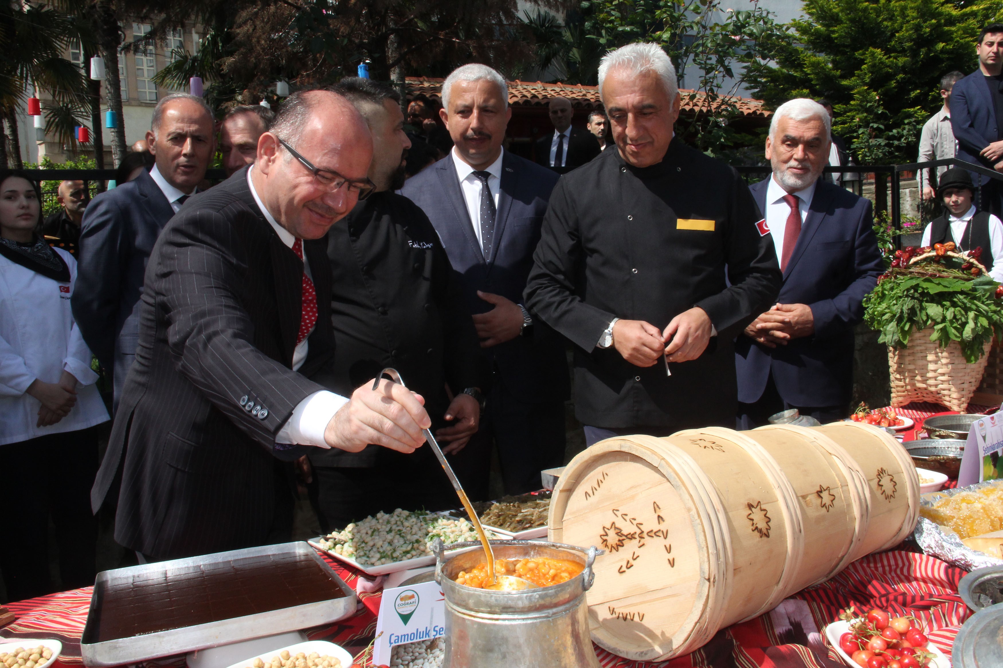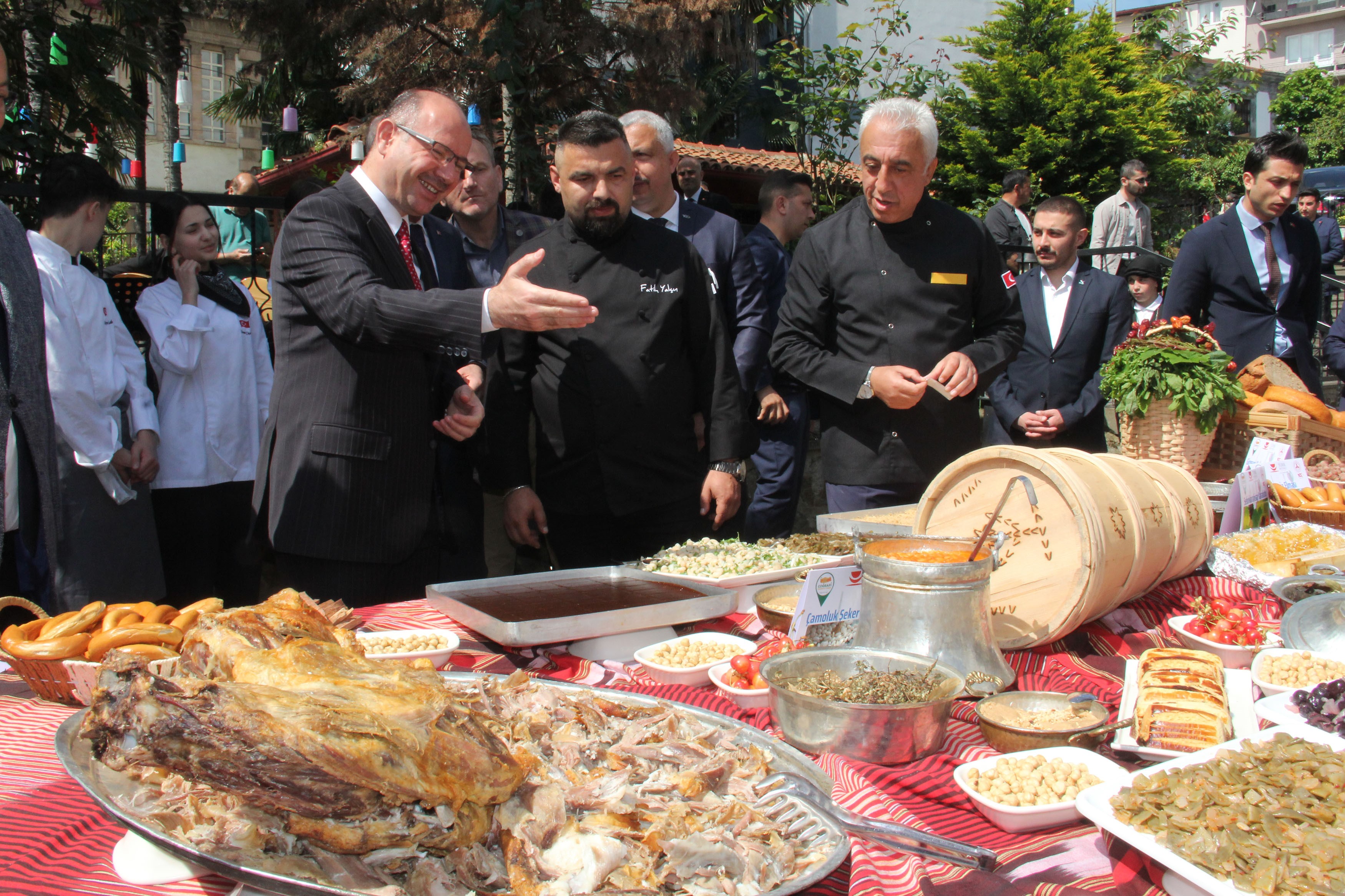 Giresun’un 13 coğrafi işaretli ürününün bulunduğunu belirten Vali Serdengeçti, ilerleyen zamanda bu sayının 30’a kadar çıkabileceğini ifade ederek “Giresun’da 13 adet coğrafi işaretli ürünümüz var. Bunu fazlalaştırmaya çalışıyoruz. Coğrafi işareti ürün şu manaya geliyor. Geleneği koruyoruz, üretimi muhafaza ediyoruz, üreticiyi koruyoruz. Bundan dolayı son derece önemli diye değerlendiriyorum. Yani bugün 13 yarın 20-30’a ulaşacaktır. Çünkü çok geniş bir spektrumda, geniş bir medeniyetin temsilcileriyiz. Kadim bir medeniyet. Giresun'un Türk mutfağındaki yeri açısından aynı zamanda Giresun tanıtımı açısından ve aynı zamanda Giresun turizm açısından ve bu turizmden kaynaklı ülkemize ve insanımıza yaşatılacak refah açısından son derece önemli buluyorum. Giresun’umuzun ait hissettiği aidiyatı olan ürünler var. Tabii bu 13 tanesi coğrafi ürünü işaretli ürün. Yani bir şekilde hem menşe adı olarak tescillenmiş hem de mahreç olarak tescillenmiş ürünler. Mesela Giresun tombul fındığı tamamıyla Giresun’a ait olduğu için coğrafi işaretli ürün. Ama aynı zamanda menşe adı olarak tescillenmiştir. Burada bakıyoruz Çamoluk Oğlak kebabı mesela. Çamoluk Oğlak Kebabı yine coğrafi işaretli ürün ama mahreç bağlamında niye bir yerine göre mahreç ve menşe adı ne demektir diye düşündüğümüz zaman menşe adı olarak tescillenirse her yönüyle Giresun ait demektir. Ama mahreç olarak tescillenmişse. Hammadde ya da üretimden sadece bir noktasının Giresun’a ait olması ve yörenin insanın tüketicinin de Giresun'a ait olduğunu bilmesi yeterli noktada. Burada hem 13 adet ürünümüz var, coğrafi işaretli ürünümüz. Yine tescilleyeceğimiz ürünler var hem de yöremize ait tüm ürünleri burada sergiliyoruz” şeklinde konuştu.