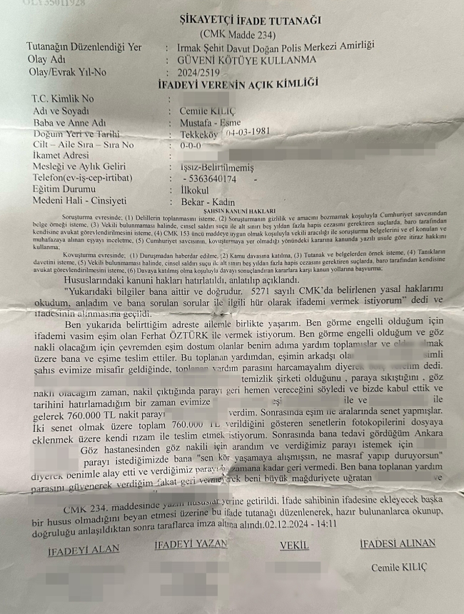Görme engelli Cemile Kılıç, mağduriyetini şu sözlerle anlattı: "Eşim çöpte çalışarak bu parayı topladı. Biz kendimiz için harcamak yerine bu kişiye borç verdik. ‘Ben size yardımcı olurum, aracım var, götürürüm, getiririm' dedi. Bu bana cazip geldi. Ankara’da tedavi görüyorum ve 3 çocuğumuz var. Bu şahıs, bir aile dostumuz tarafından bize tanıştırıldı. ‘İhtiyacı var, 15 gün sonra alırsınız’ dediler. Ancak paramızı geri alamadık."