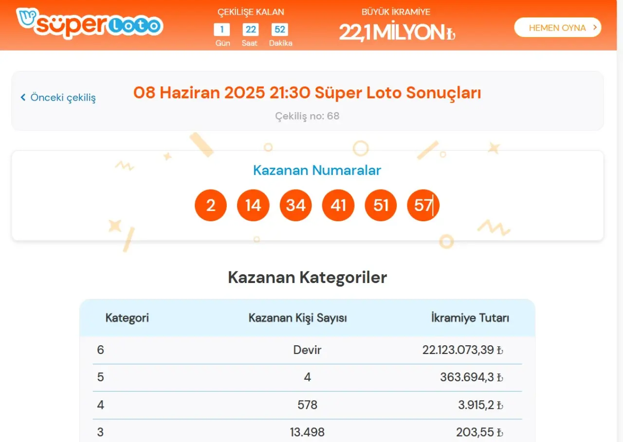 Süper Loto’nun bir sonraki çekilişi 10 Haziran 2025 Salı akşamı gerçekleştirilecek. Kurban Bayramı’ndan sonraki ilk güne denk gelen çekiliş, 22 milyon lira devirli şekilde gerçekleştirilecek.