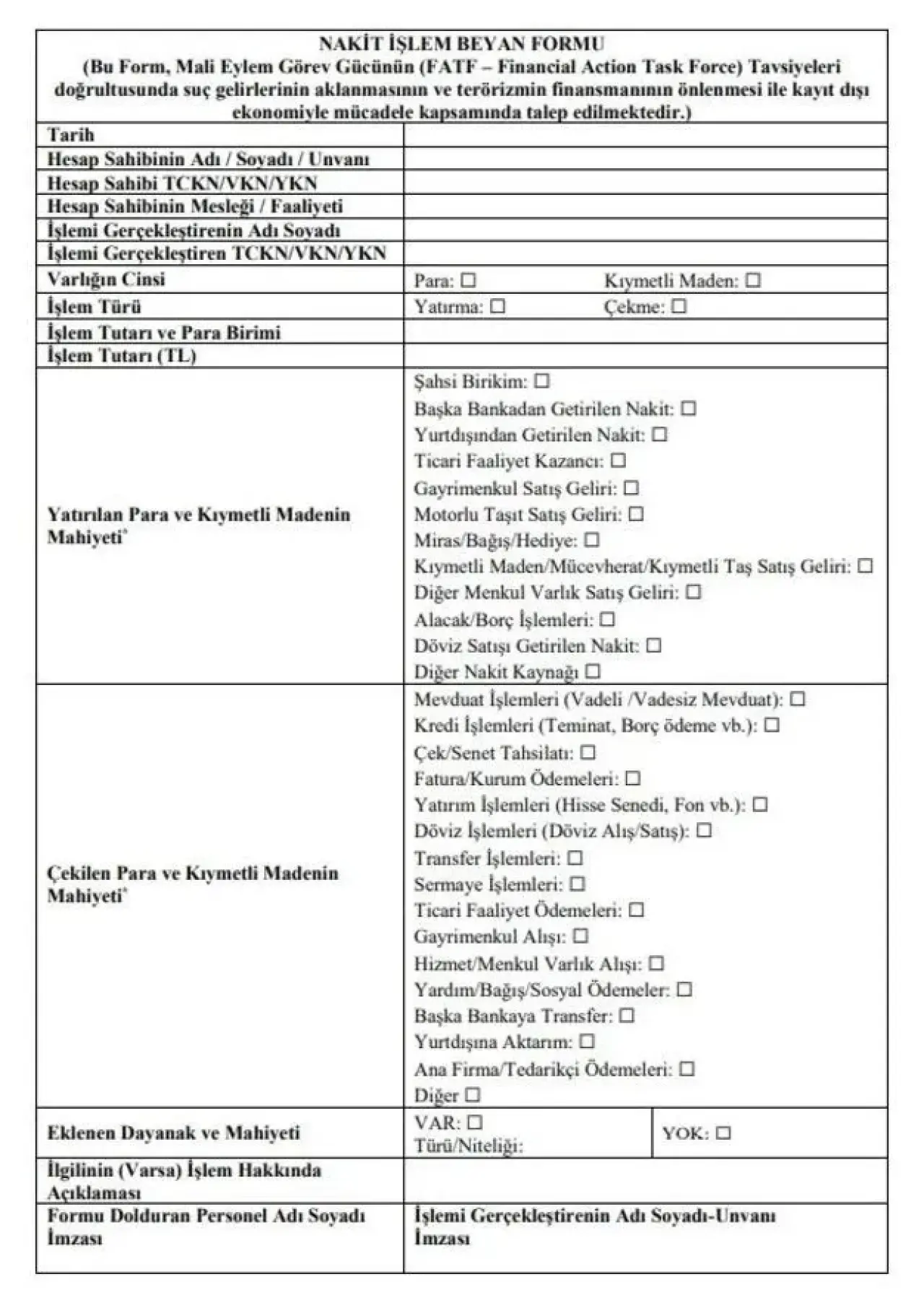 “Nakit İşlem Beyan Formu” doldurmalarını isteyecek. İlgili forumda verilen beyanların ve belgelerin yeterli görülmemesi durumunda para transferine izin verilmeyecek. Söz konusu uygulamanın; yalnızca mobil ve internet üzerinden yapılan para transferlerini değil, banka şubesi ve ATM üzerinden yapılan işlemleri de kapsayacağı öğrenildi.