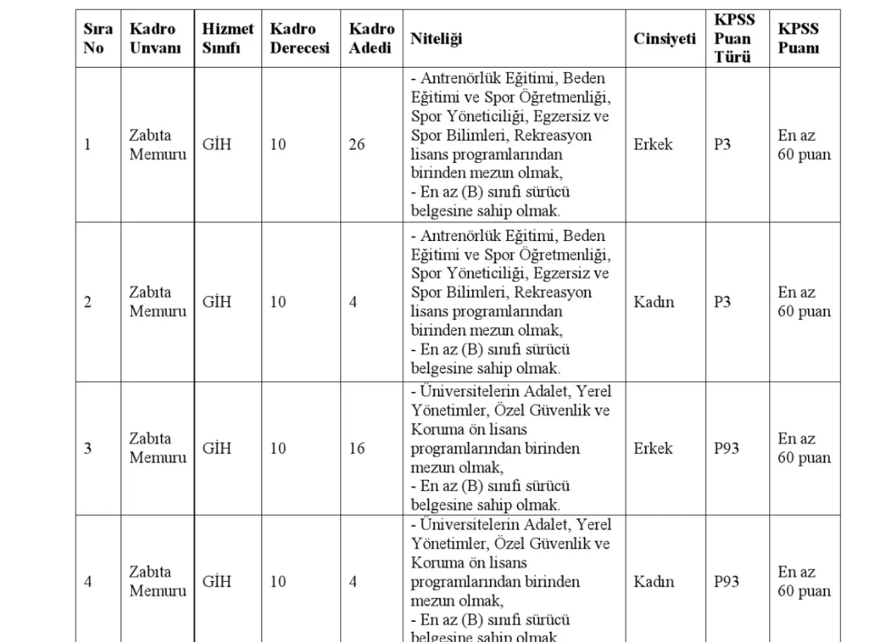 Başvurmak isteyen adayların Türkiye Cumhuriyeti vatandaşı olması, kamu haklarından mahrum bulunmaması ve atanacağı kadronun gerektirdiği diğer yasal şartları taşıması gerekiyor. Ayrıca, ilan edilen zabıta kadroları için KPSS puanı üzerinden yapılacak sıralama dikkate alınacak.