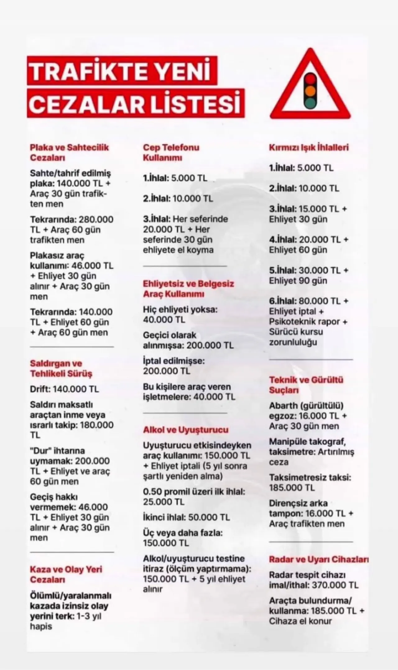 • Alkollü araç kullanma cezası – 25 bin TL + 6 ay ehliyete el koyma (Her tekrarda 2’ye katlama) Alkol ölçümü yaptırmama cezası 150 bin TL + 5 yıl ehliyete el koyma