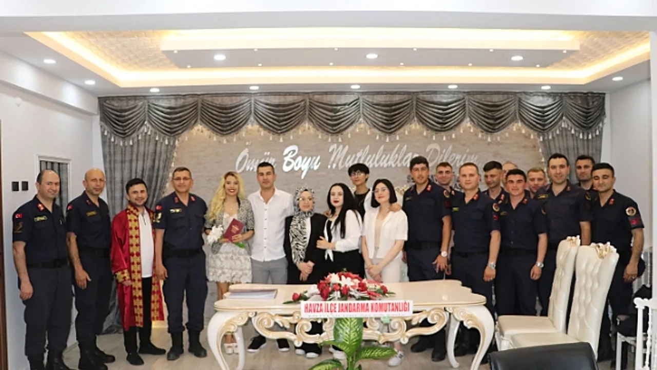 Havza Belediyesi Nikah Salonunda kıyılan genç çiftin mutluluğuna şahitliği Havza İlçe Jandarma Komutanı Kıdemli Başçavuş Özkan Parlak, Karakol Komutanı Kıdemli üstçavuş İsmail Değirmen, Şerife Karaçoban ve Şevval Karaçoban oldular.
