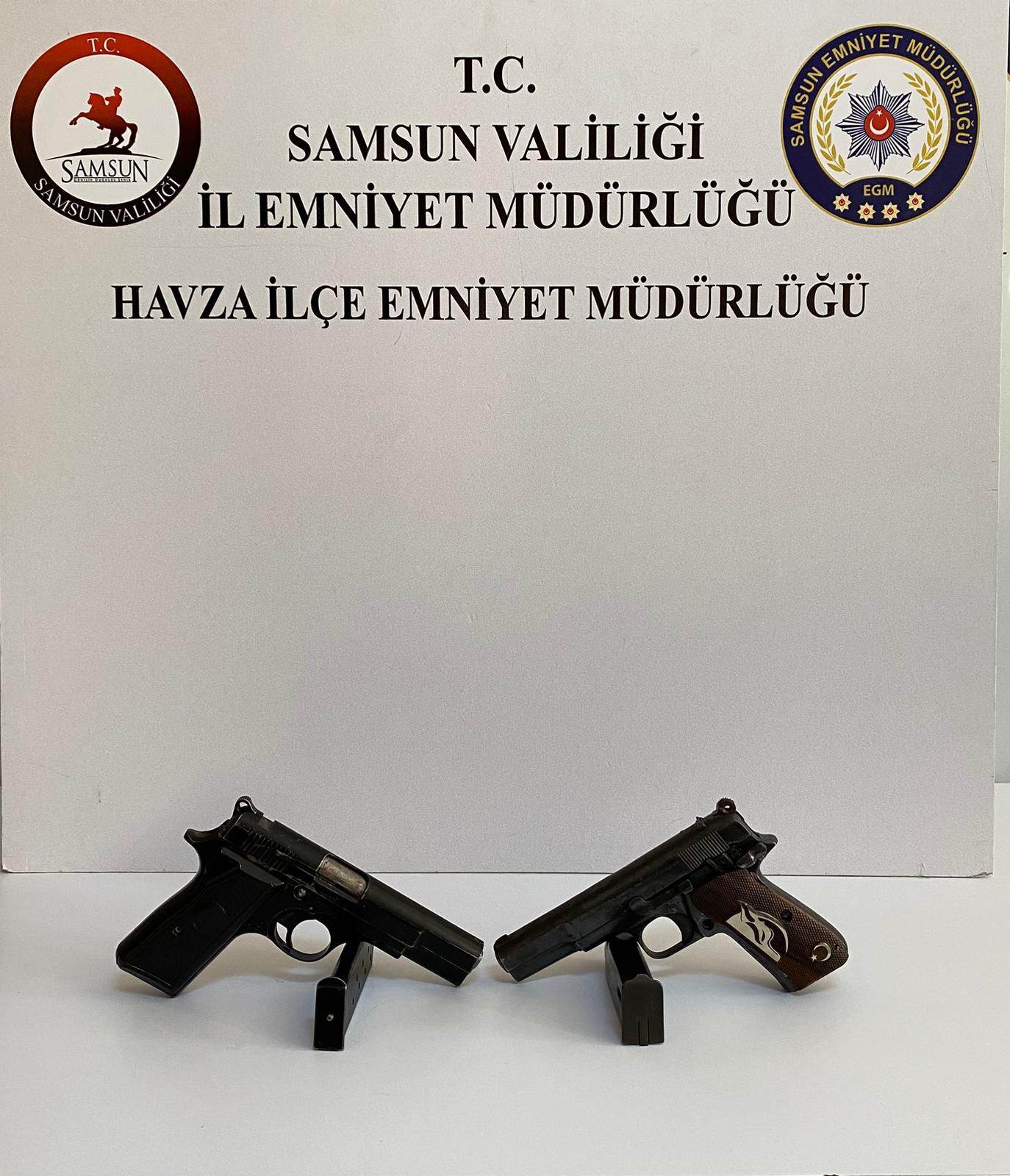 Havza İlçe Emniyet Müdürlüğü ekiplerince asayiş denetimi kapsamında bir kıraathanede arama yapıldı. Kıraathanede üst araması yapılan B.A'nın üzerinde 2 ruhsatsız tabanca ele geçirildi.