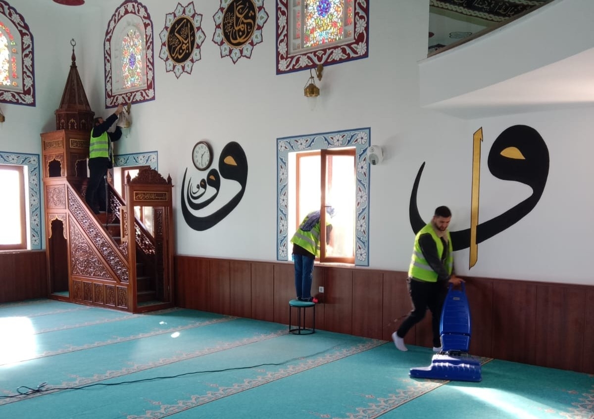 Proje kapsamında, cemaatin sıkça temas ettiği halılar, şadırvanlar, tuvaletler, camlar, ayakkabılıklar ve kapılar özenle hijyenik hale getiriliyor.