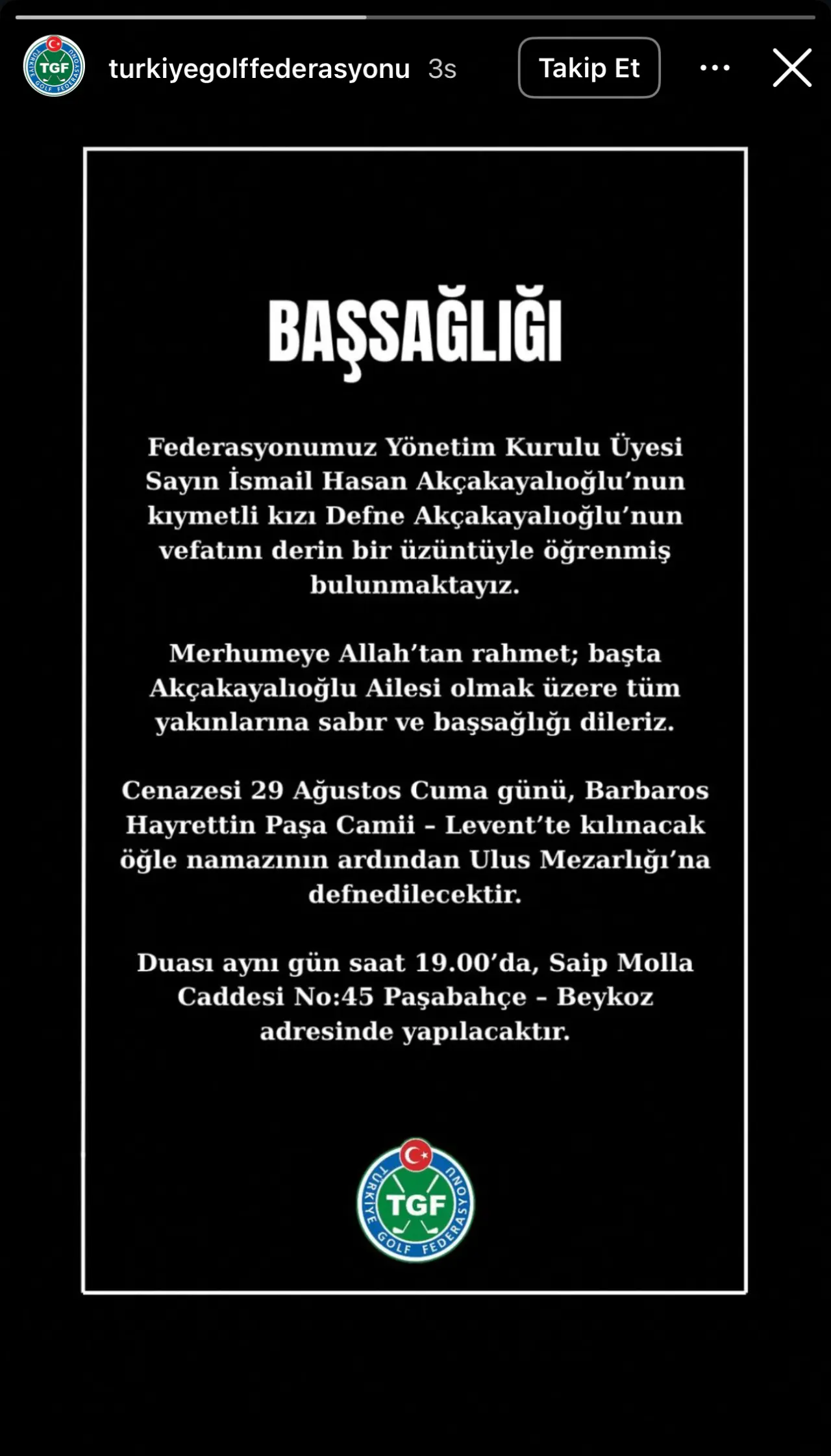 Türkiye Golf Federasyonu, Yönetim Kurulu Üyesi İsmail Hasan Akçakayalıoğlu’nun kızı olan Defne Akçakayalıoğlu’nun vefatının derin bir üzüntü yarattığını duyurdu. Federasyondan yapılan açıklamada, "Federasyonumuz Yönetim Kurulu Üyesi Sayın İsmail Hasan Akçakayalıoğlu’nun kıymetli kızı Defne Akçakayalıoğlu’nun vefatını derin bir üzüntüyle öğrenmiş bulunmaktayız. Merhumeye Allah’tan rahmet; başta Akçakayalıoğlu Ailesi olmak üzere tüm yakınlarına sabır ve başsağlığı dileriz. Cenazesi 29 Ağustos Cuma günü, Barbaros Hayrettin Paşa Camii – Levent’te kılınacak öğle namazının ardından Ulus Mezarlığı’na defnedilecektir. Duası aynı gün saat 19.00’da, Saip Molla Caddesi No:45 Paşabahçe – Beykoz adresinde yapılacaktır." denildi.