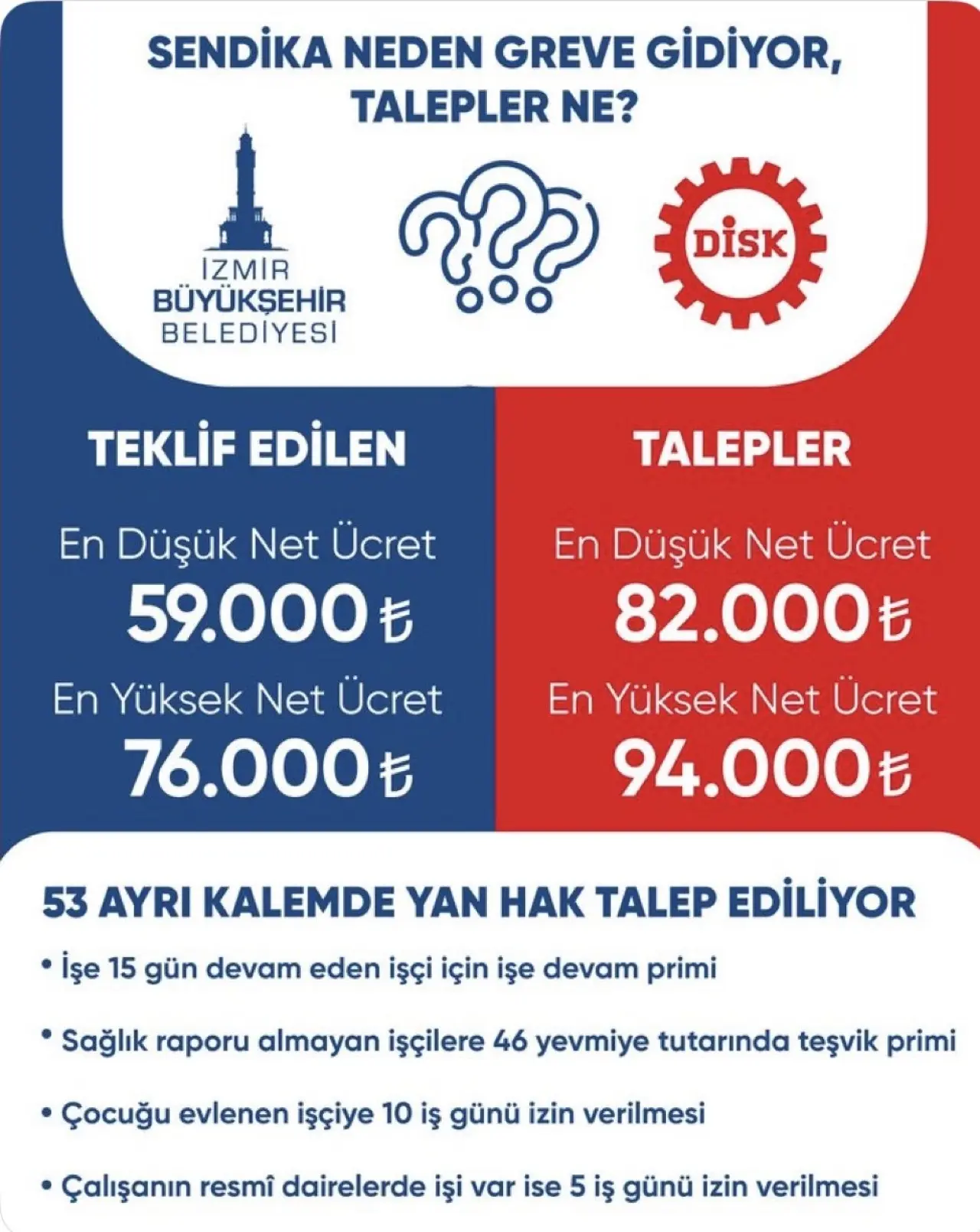 İzmir Belediyesi’nin tüm tekliflerini reddeden işçi tarafı grev kararını uygulamaya koydu. Mayıs ayının sonunda başlayan grev, Haziran ayına da sarktı. İzmir’de belediyenin sunduğu hizmetlerin pek çoğu aksamaya başlarken, çalışanların talepleri ise adeta duyanların ağızlarını açık bıraktı. İzmir’de greve giden çalışanların talepleri şu şekilde sıralandı ve bu taleplerden geri adım atılmayacağı belirtildi: