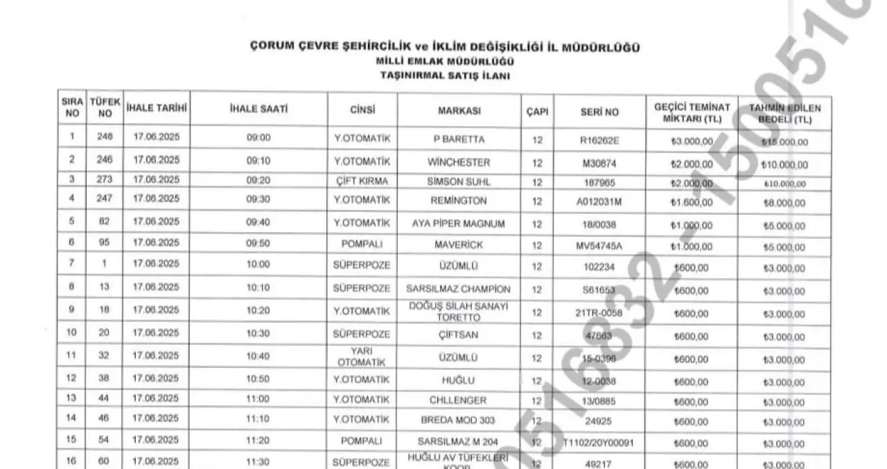 ARENA ÖZEL HABER/Çorum Çevre, Şehircilik ve İklim Değişikliği İl Müdürlüğü, kaçak avda el koyduğu yivsiz av tüfeklerini ihale yoluyla satışa çıkardı. Müdürlük, farklı marka ve cinste toplam 68 adet tüfeği, 229 bin TL tahmini bedelle satışa çıkardı. Kaçak tüfekler, toplam 229 bin TL tahmini bedelle 2886 sayılı Devlet İhale Kanununun 51. maddesinin (a) bendi kapsamında pazarlık usulü yönetemiyle satılacak. Müdürlük, 17 Haziran ile 17 Temmuz 2025 tarihlerinde yapılacak olan iki farklı ihaleye, av tüfeği satıcılık (Bayi) izin belgesine sahip gerçek ve tüzel kişilerin katılabileceğini bildirdi.